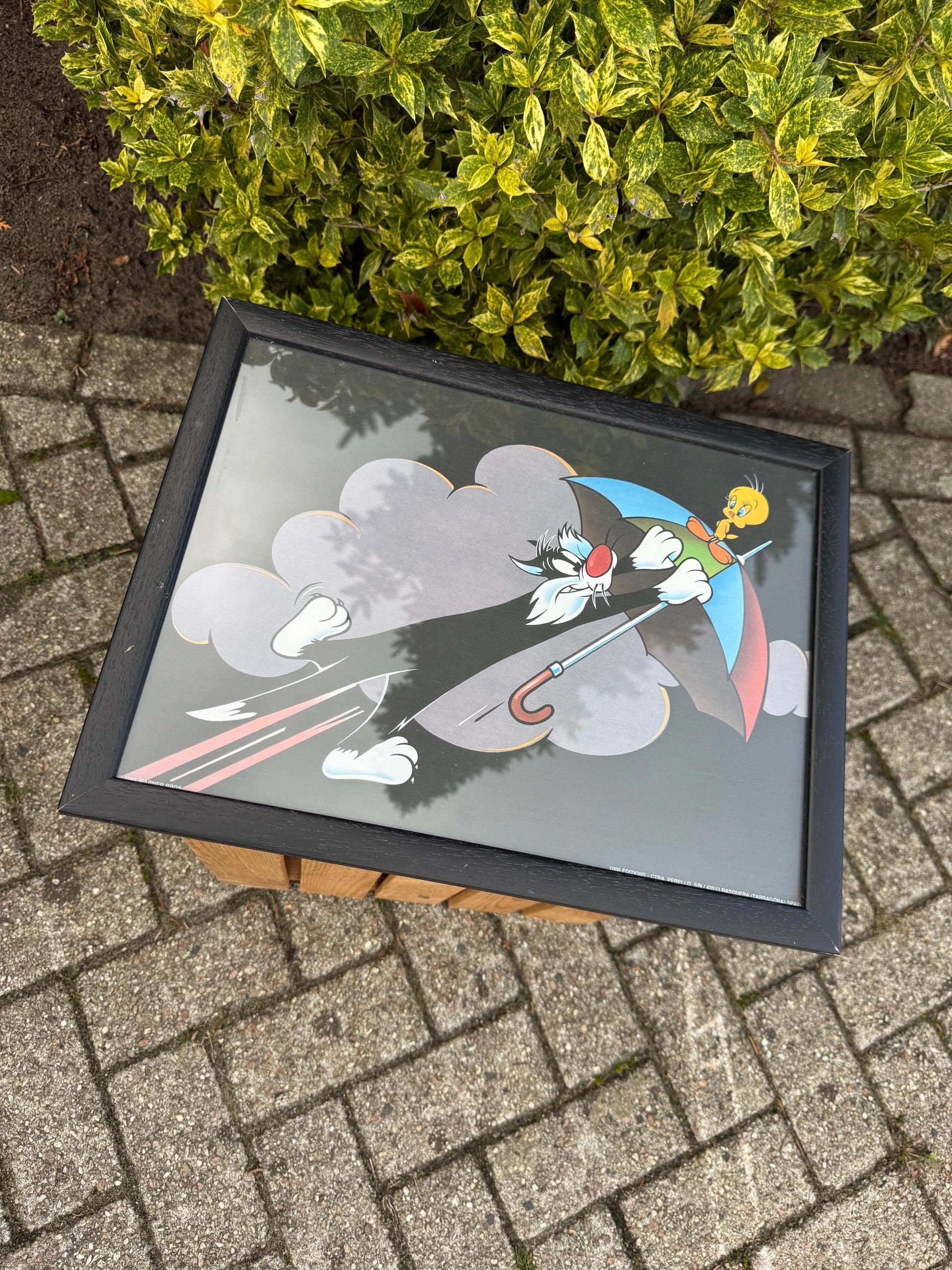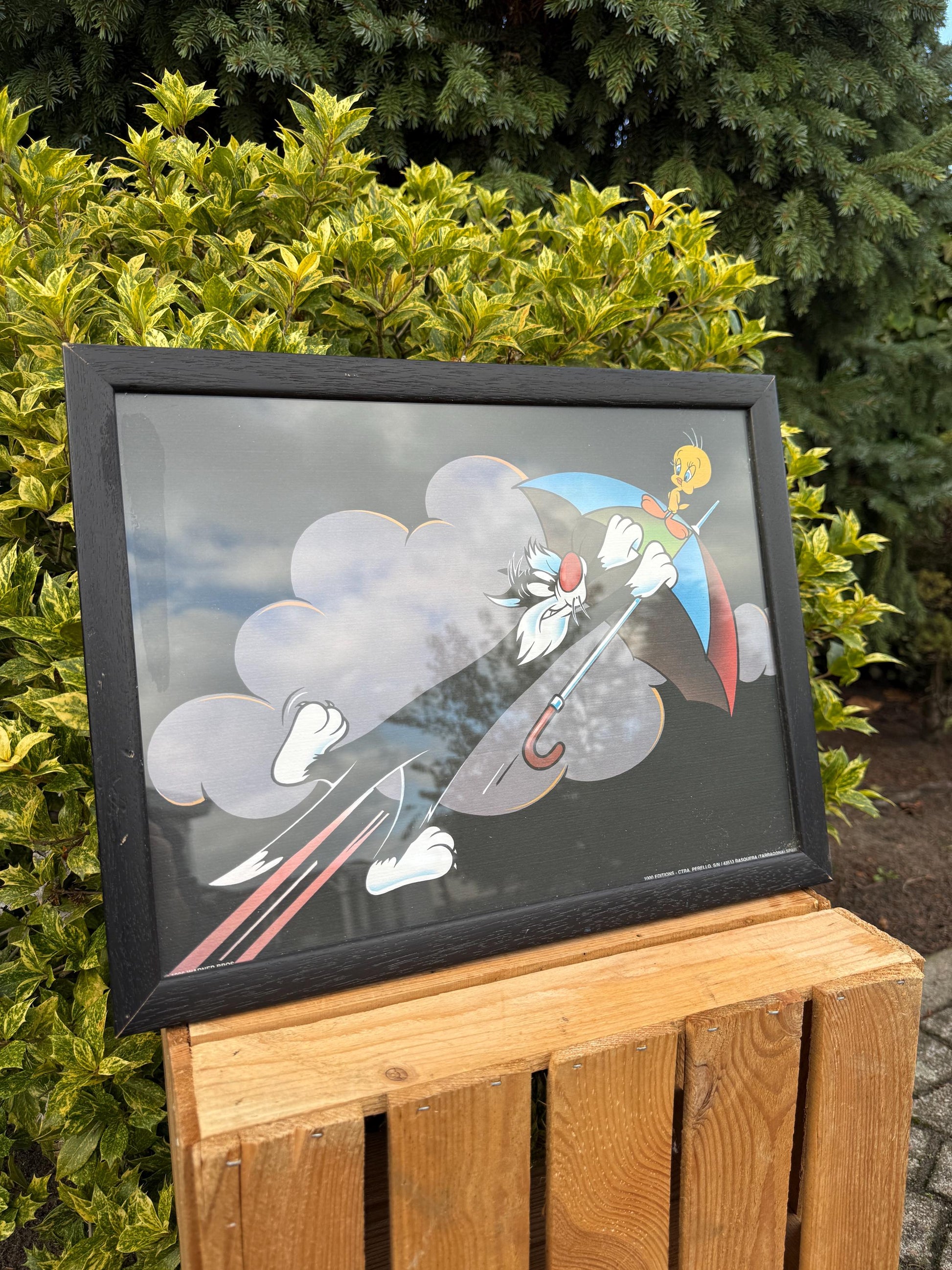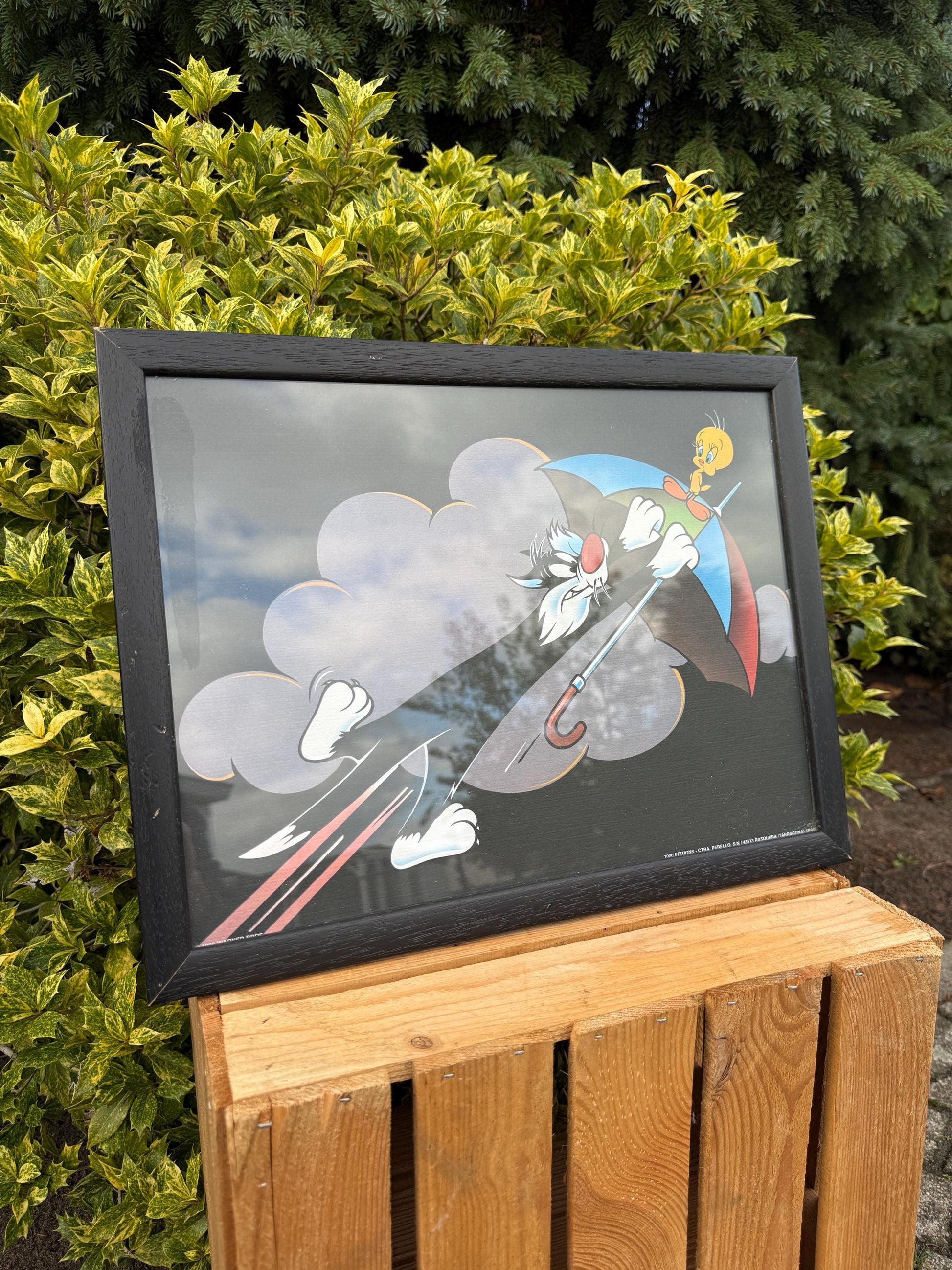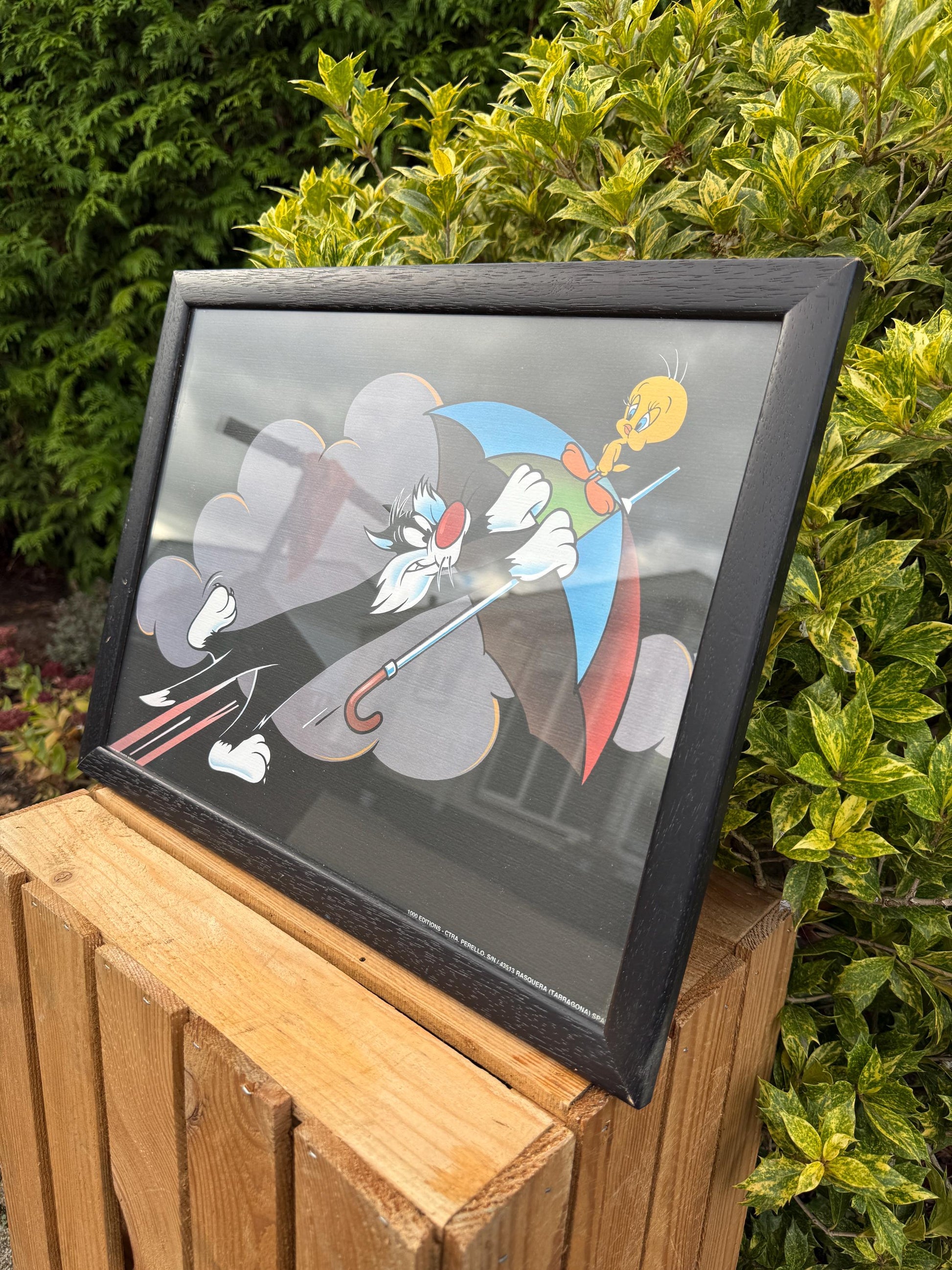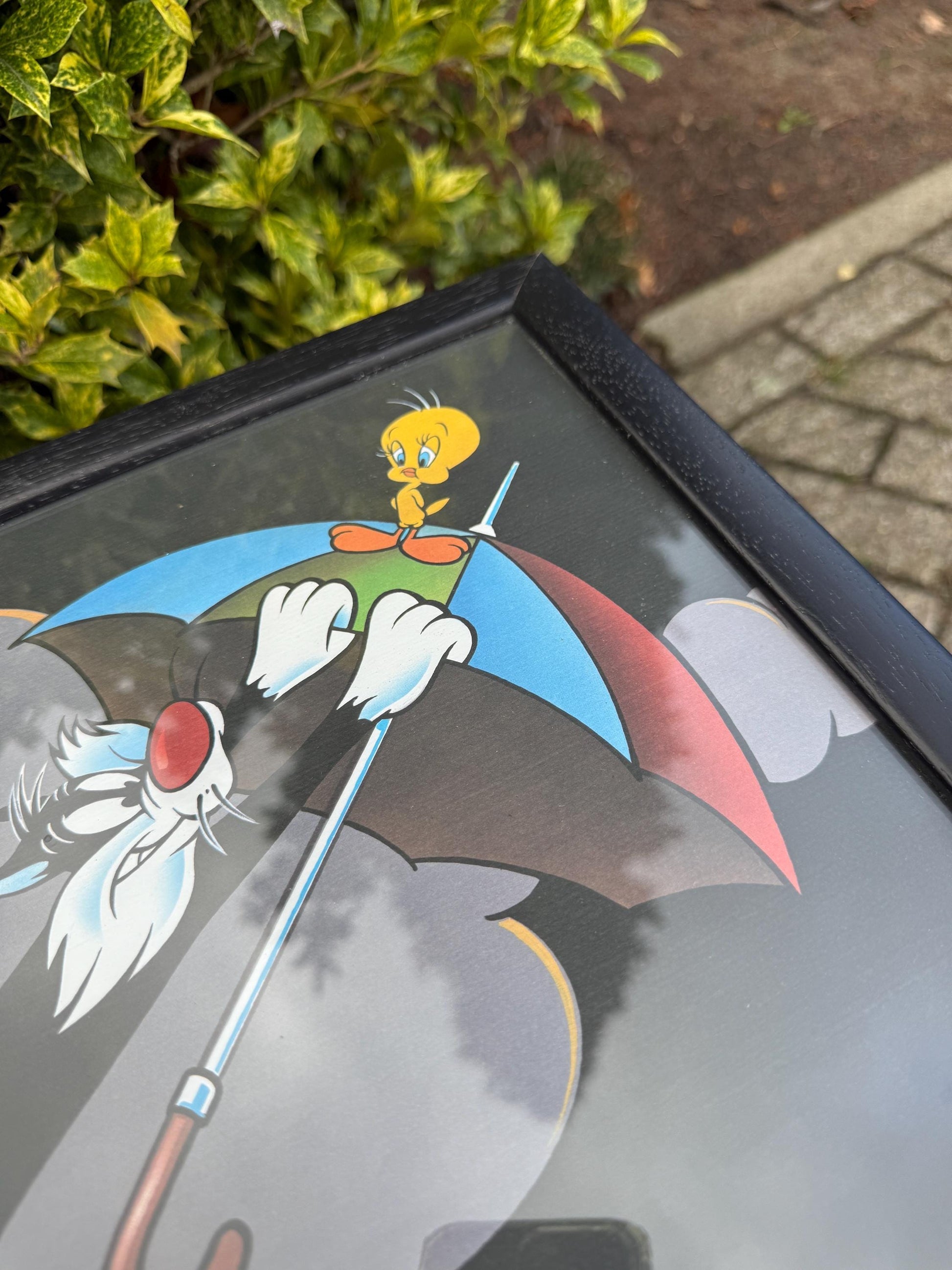This framed Looney Tunes poster features Sylvester and Tweety in a playful rain scene, officially licensed by Warner Bros.