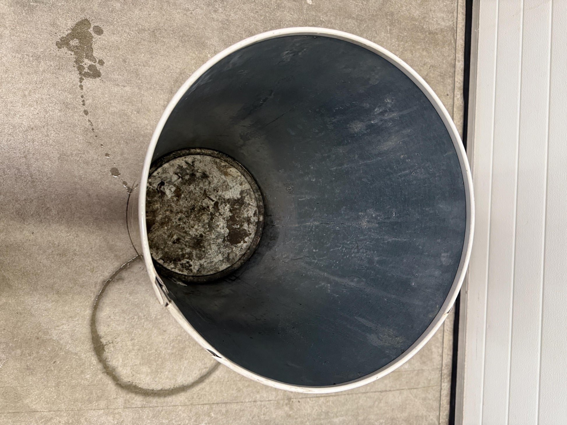 Made of sturdy plastic with a metal lid. Functional with some blemishes and small tears along the bottom edge typical for its age.