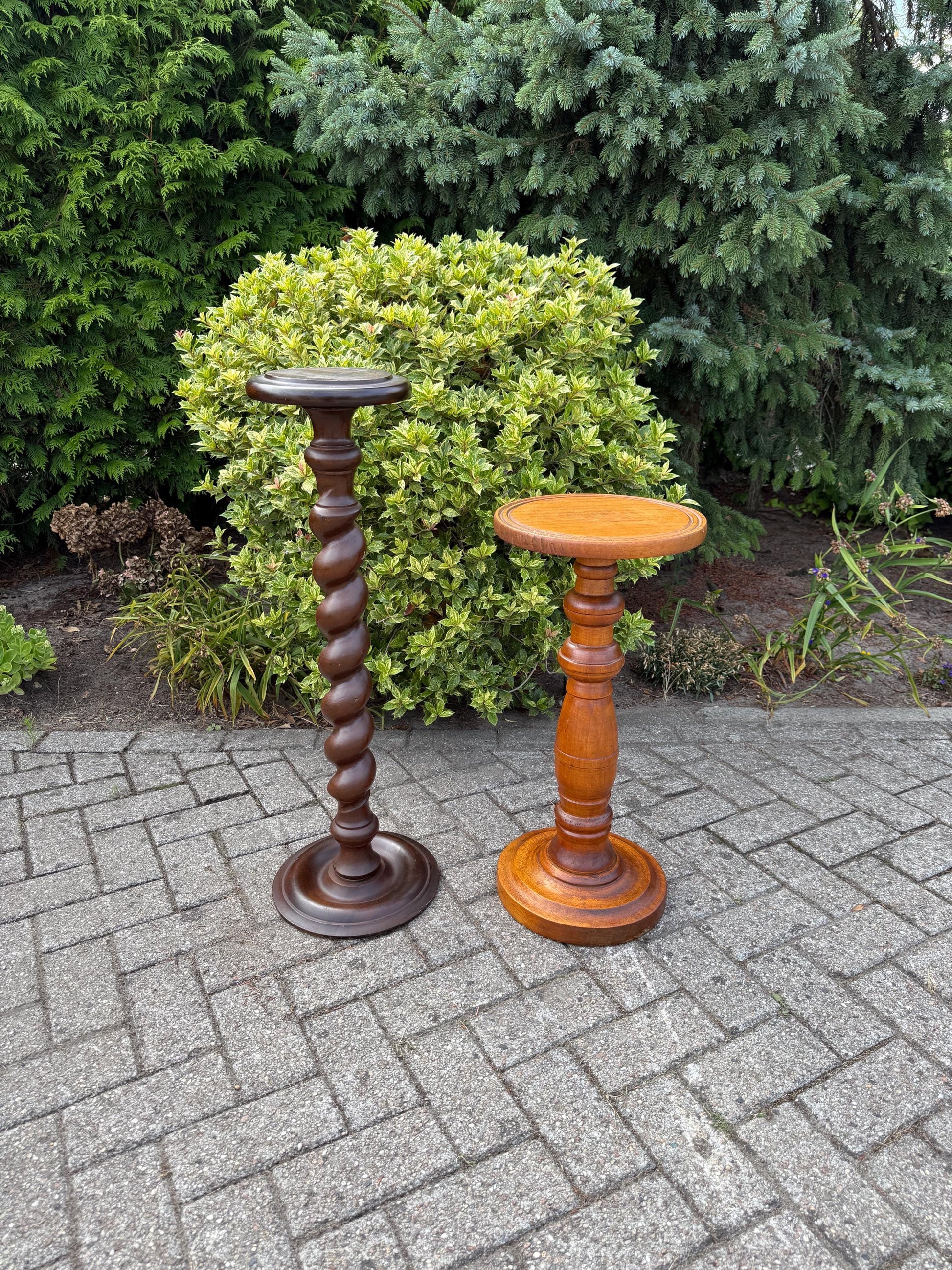 One table features a rich dark brown finish with a barley twist column, the other a lighter wood tone with a turned base. Great for plants, sculptures, or decorative display.
