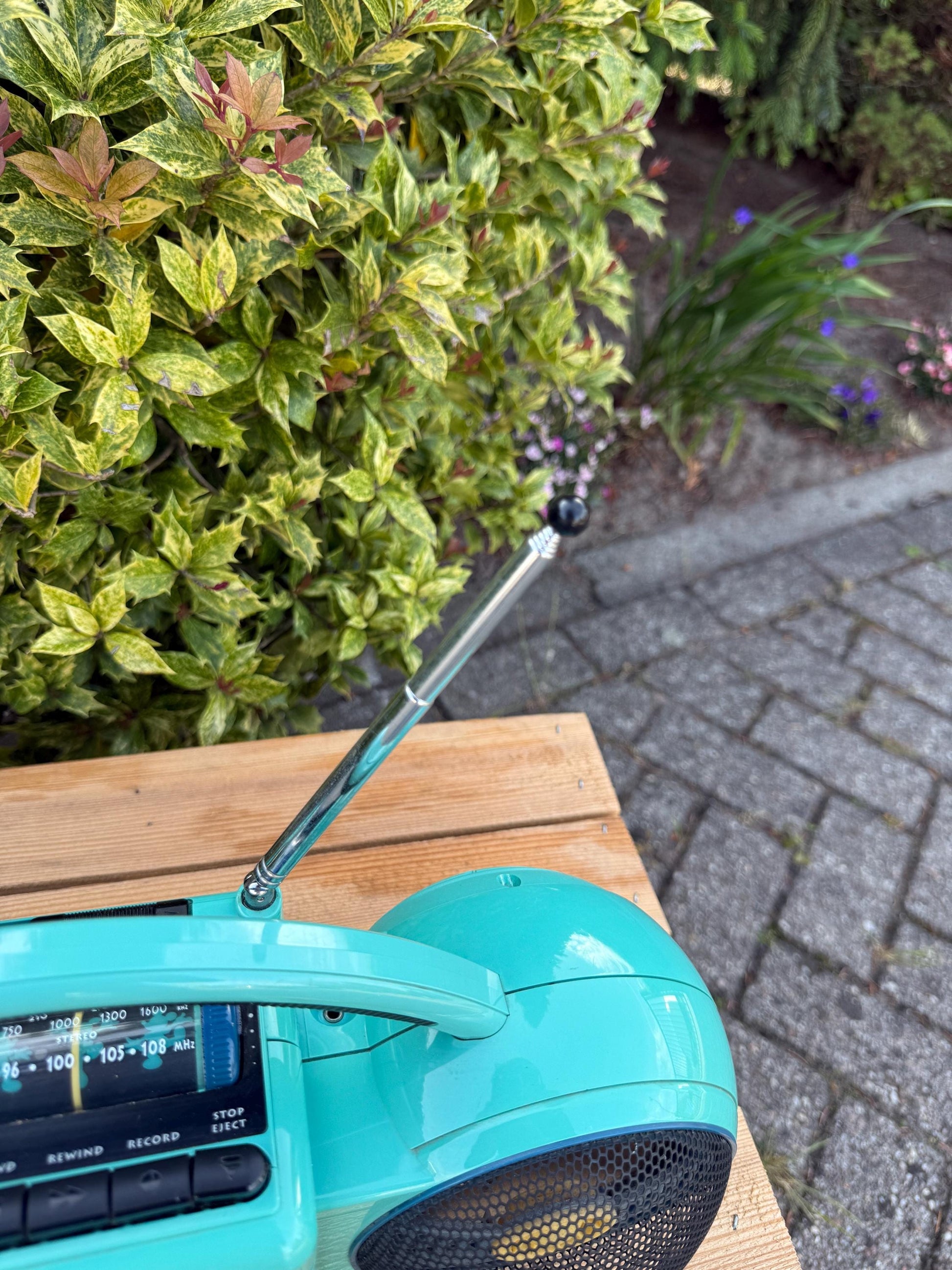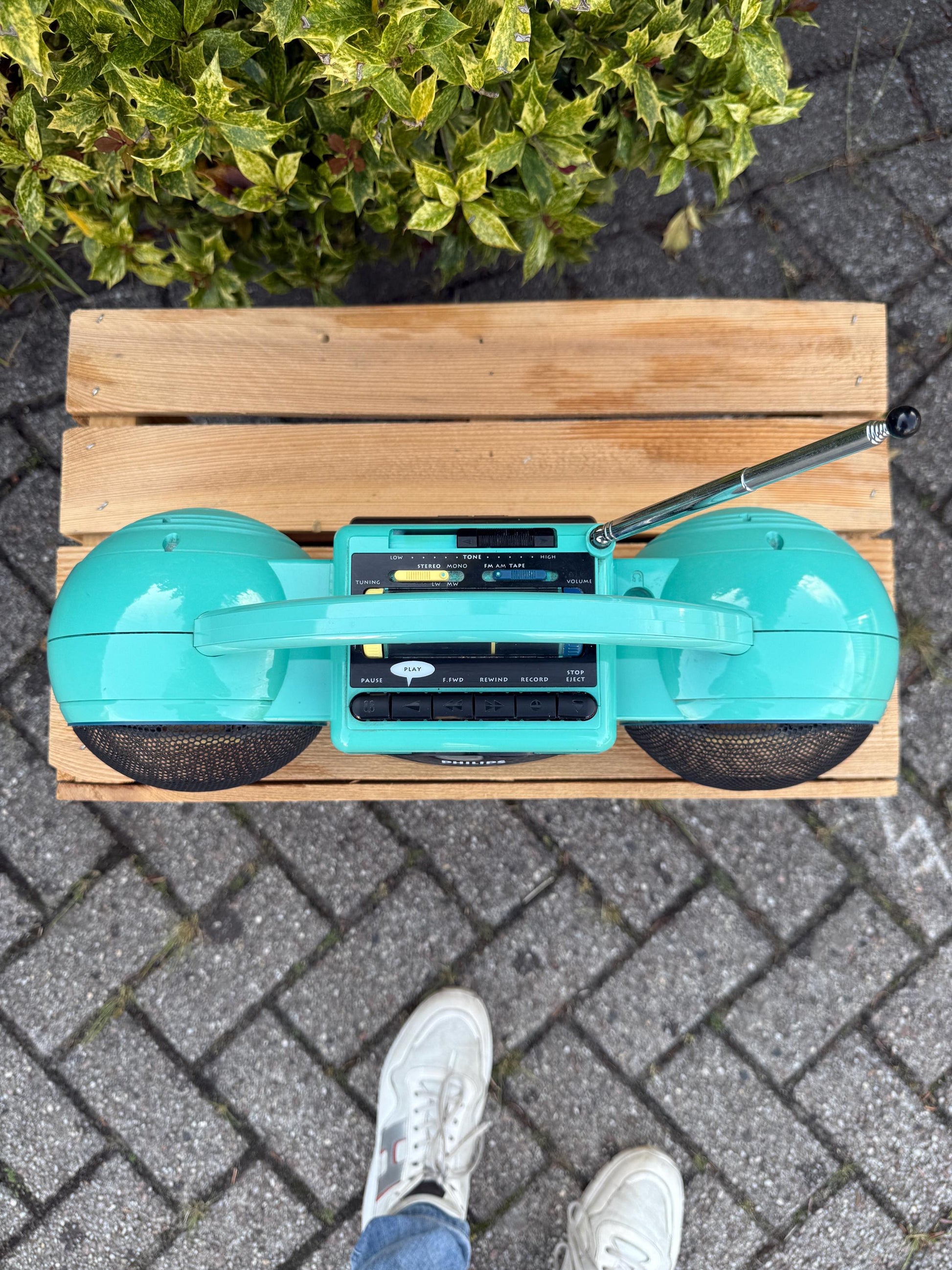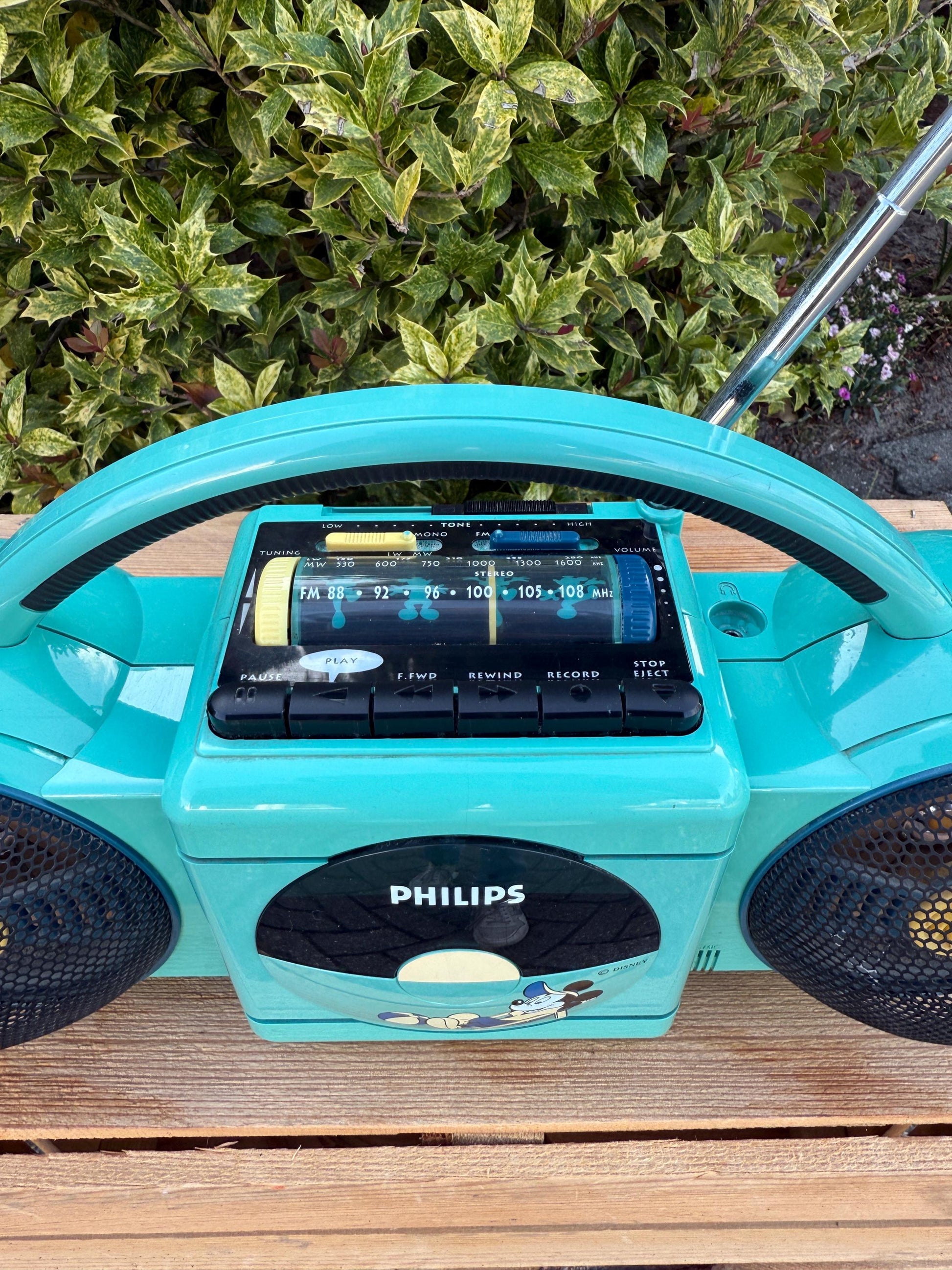 Original Philips D8017 Roller 2 radio from 1985 in blue with a Mickey Mouse design. This rare model combines playful design with vintage functionality and is ideal for collectors, Disney fans, or as a unique decorative radio.