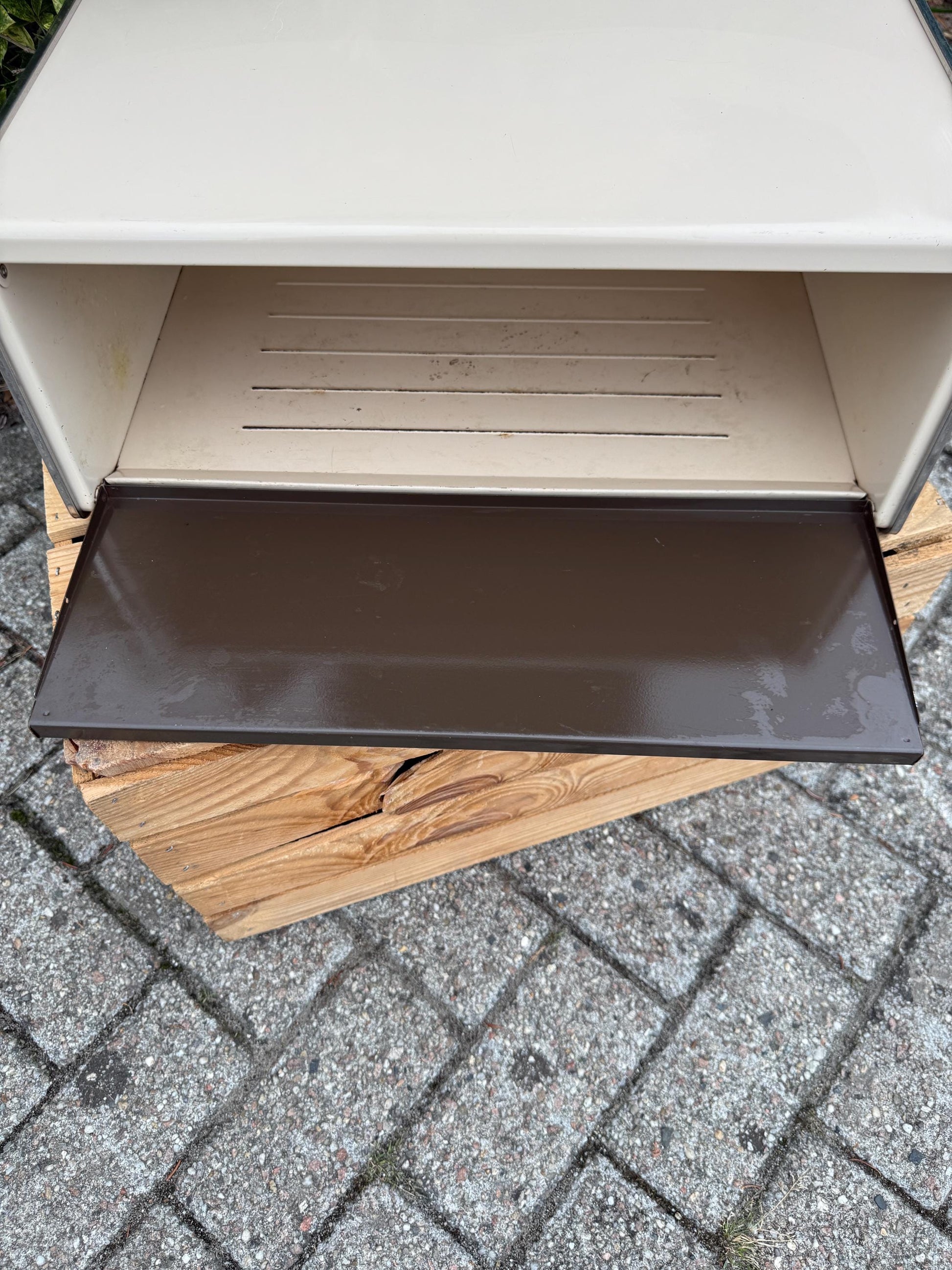 This vintage Brabantia bread box is crafted from metal with a brown and white finish and a front flap opening. Originally designed as a kitchen breadbin, it also works as a practical storage container with a classic Dutch design look.