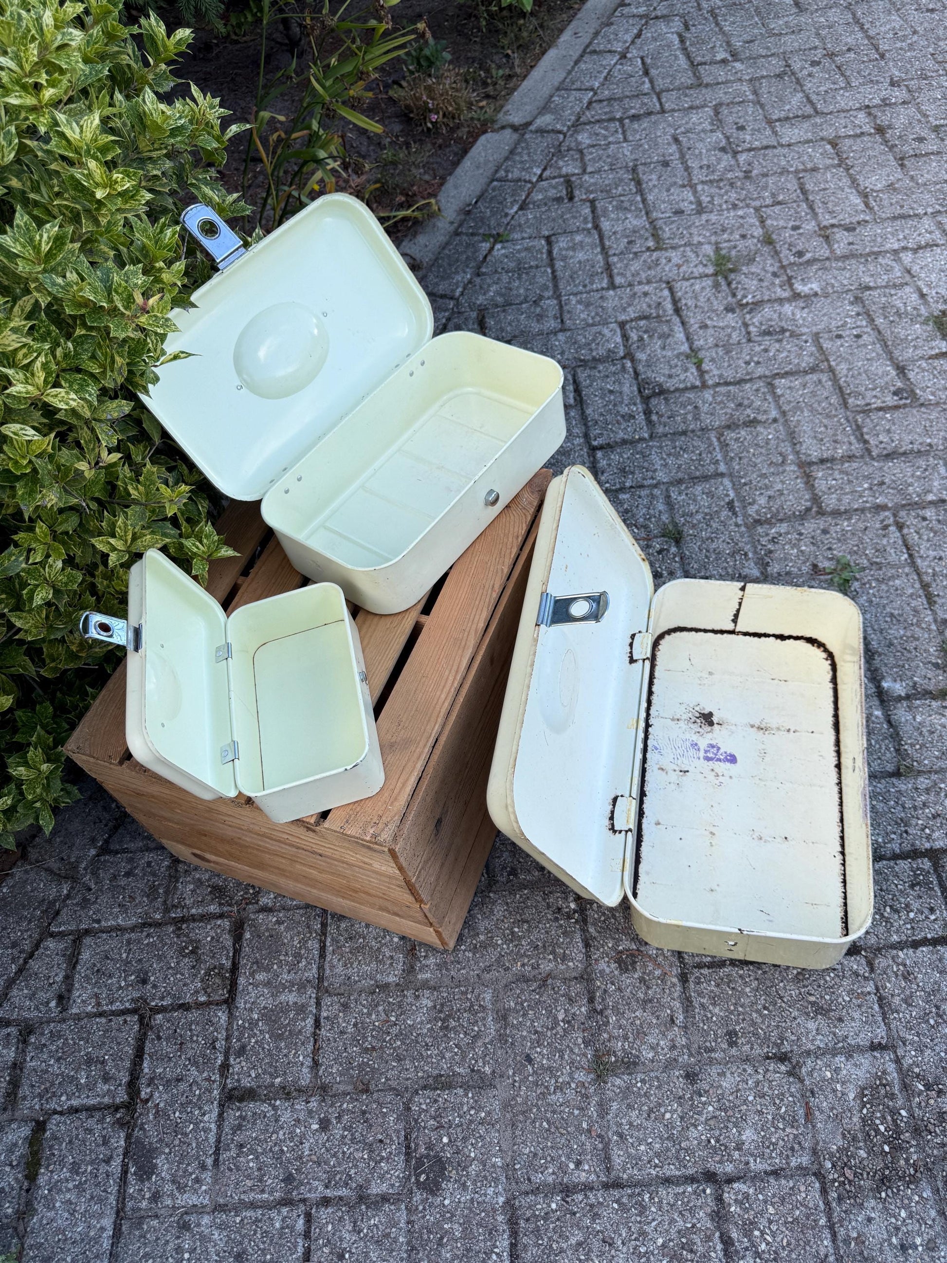 This vintage set features three Brabantia bread boxes in small, medium, and large sizes. Made of white metal with lids and handles, they show wear and patina, giving them an industrial character.