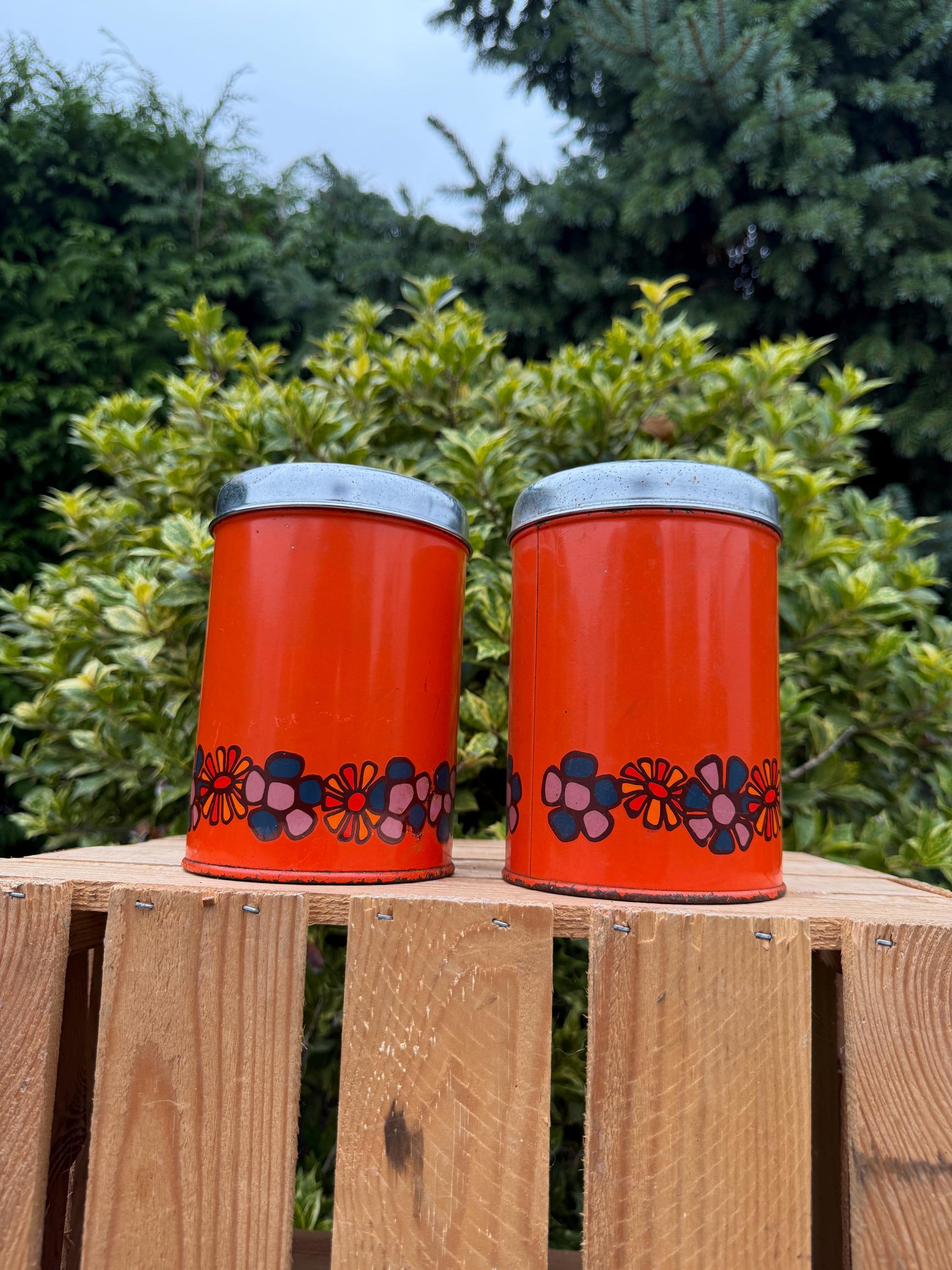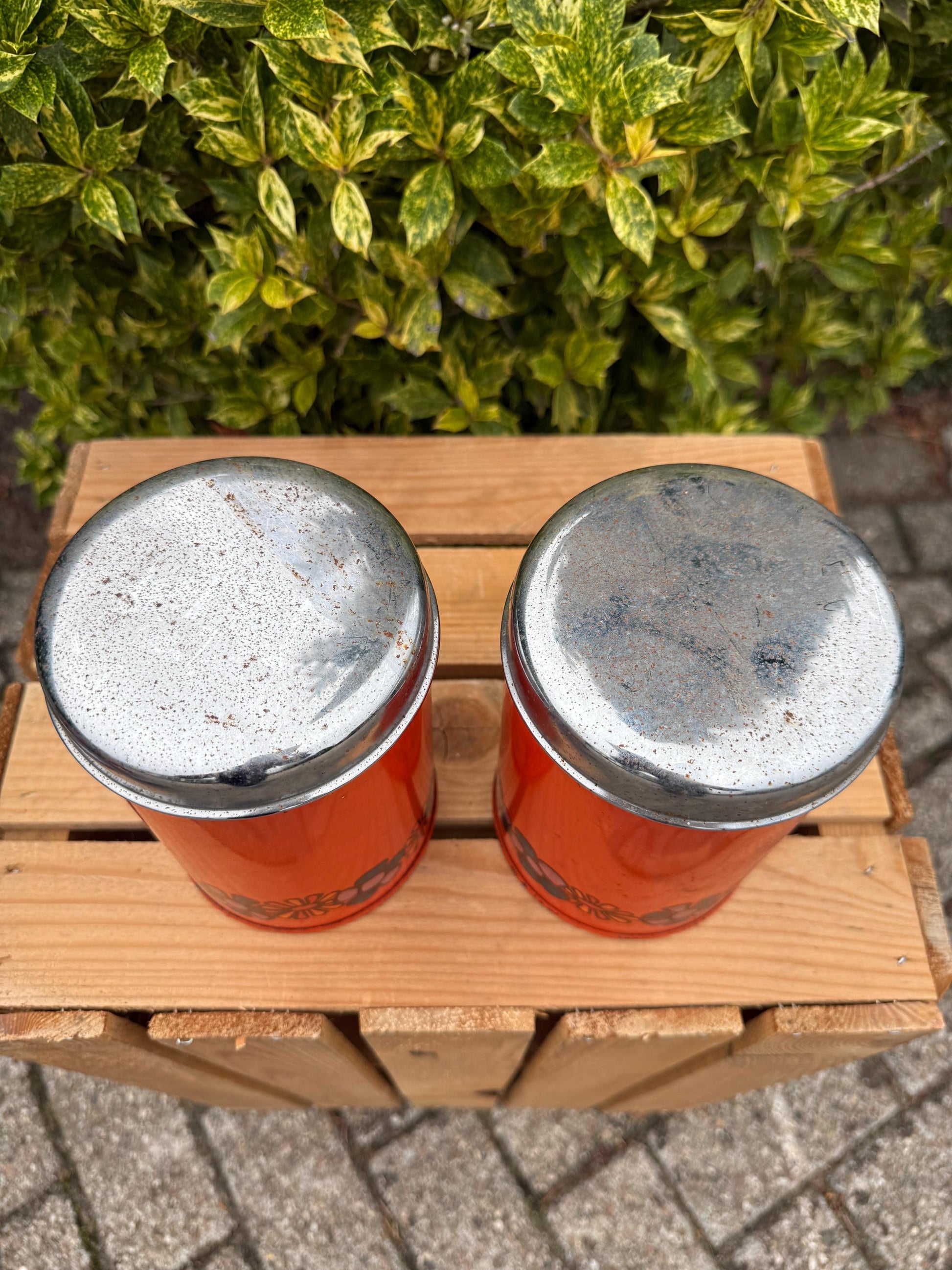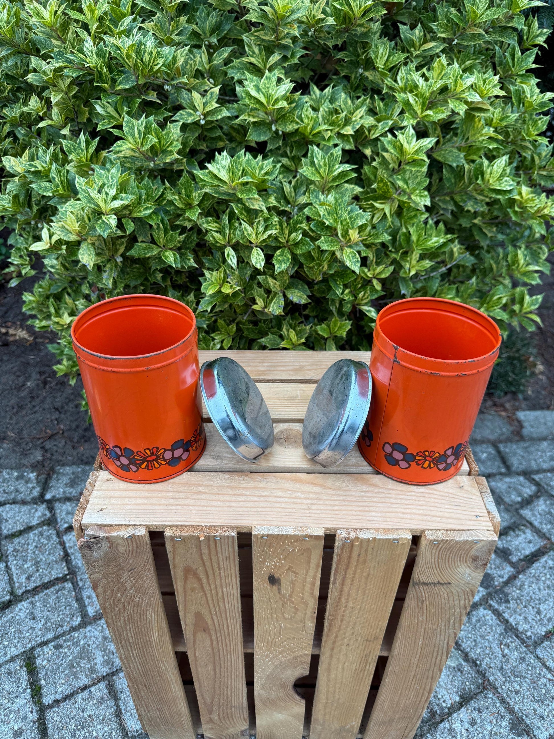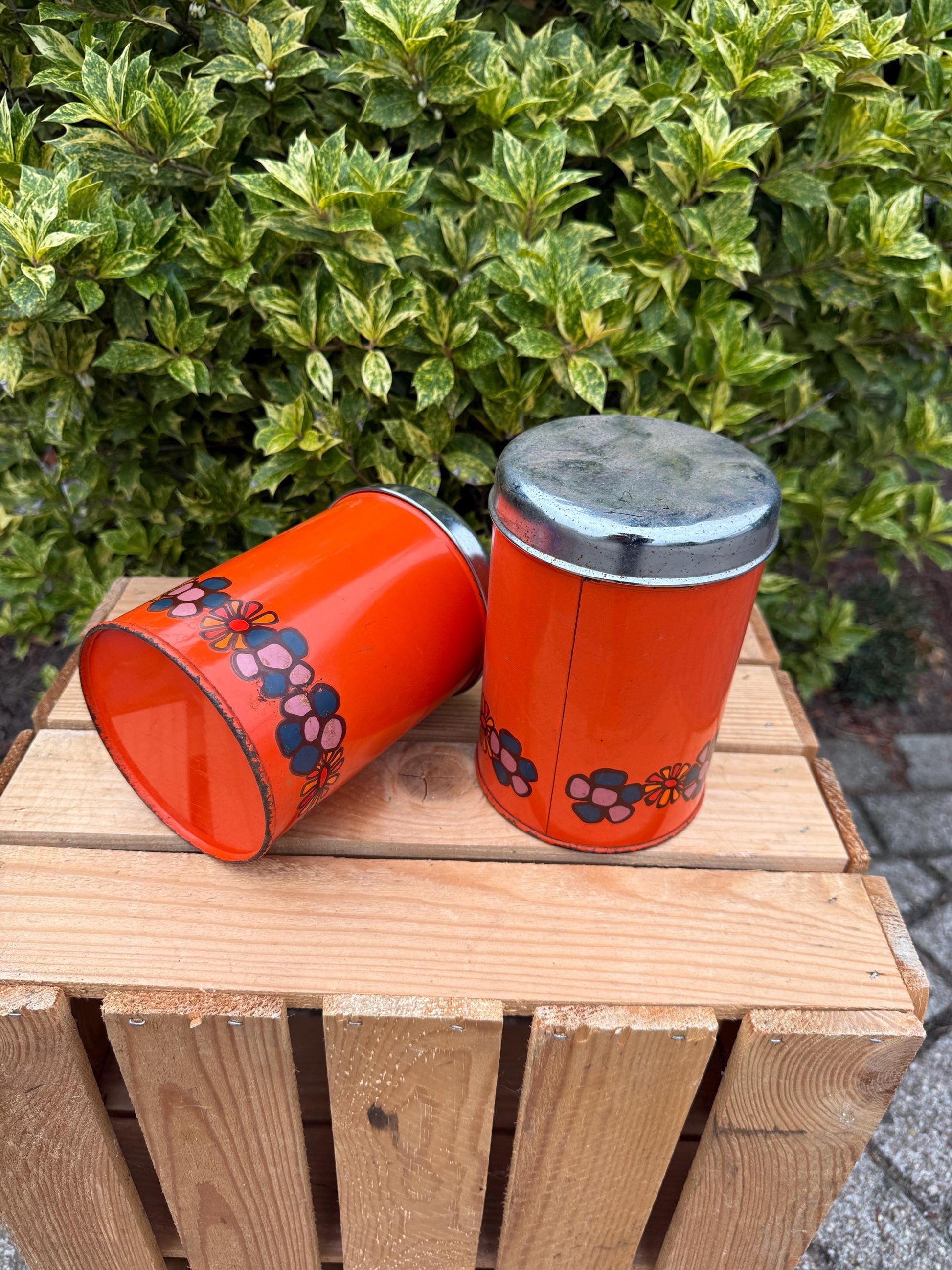 Vintage Brabantia Canisters, Set Of 2 Orange Metal Storage Tins, Flower Print Kitchen Containers, 1970s Dutch Design Steel Jars