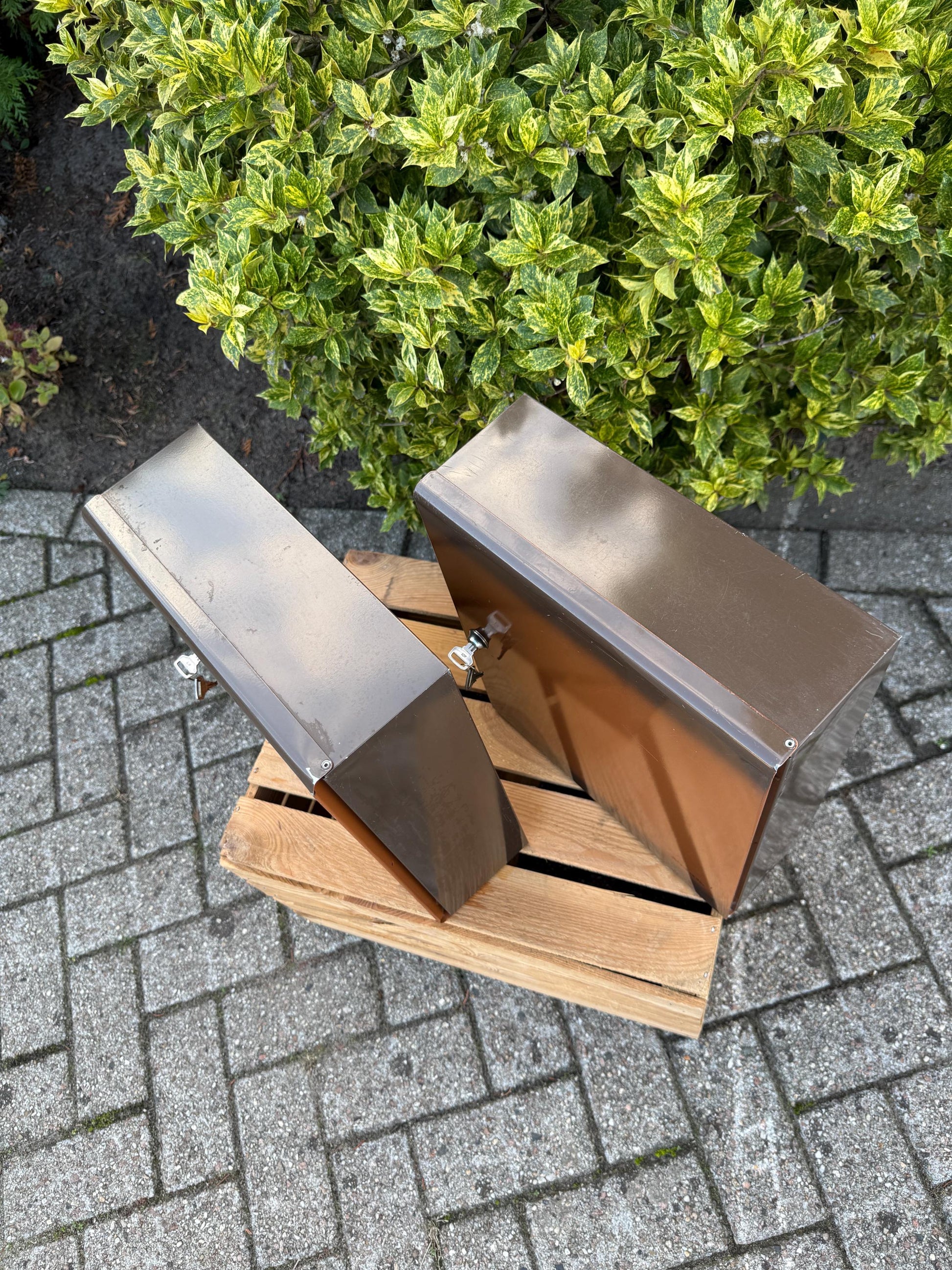 This vintage Brabantia medicine cabinet is made of sturdy metal in classic brown tones and includes two interior shelves.