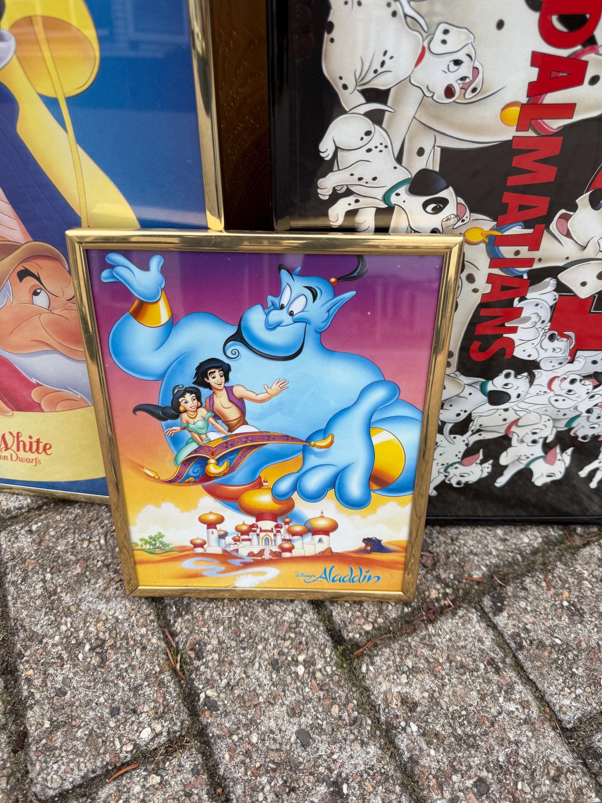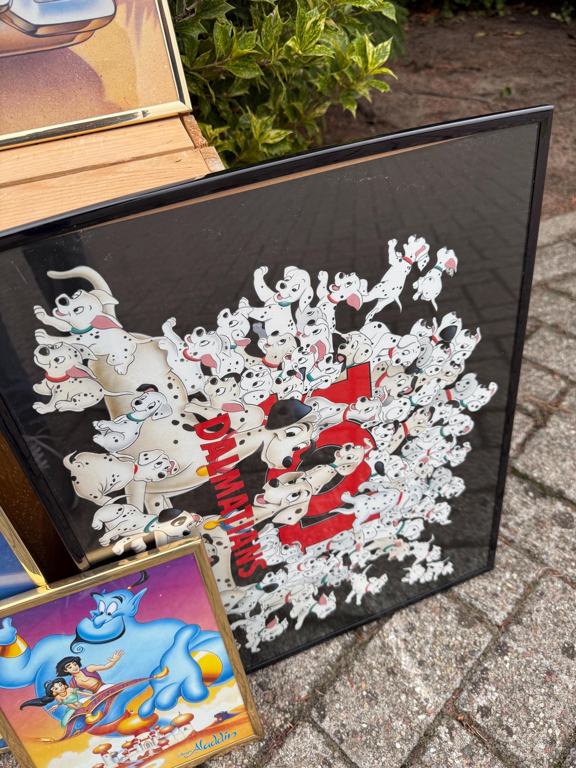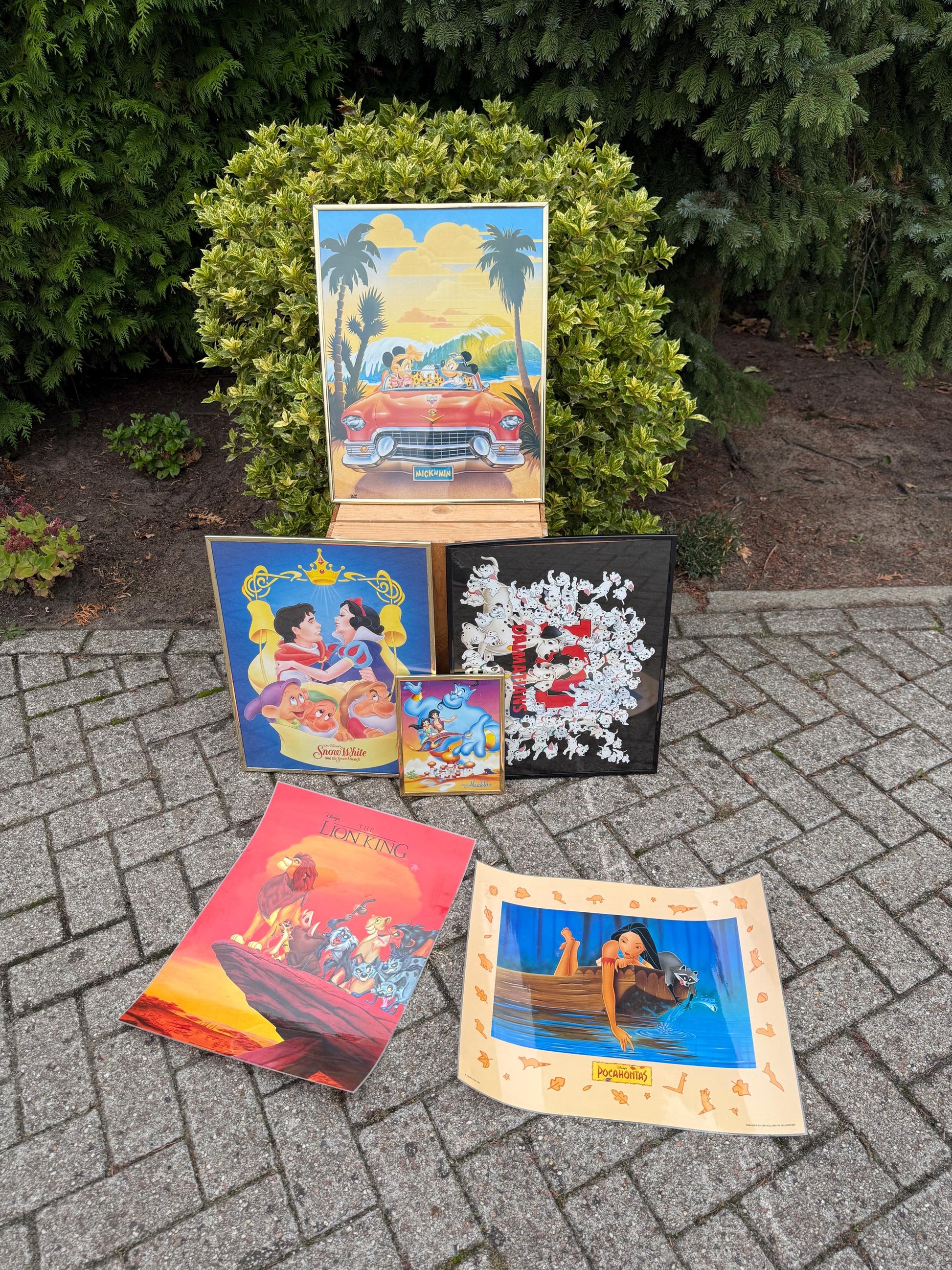 Original vintage Disney posters from the 1990s featuring classic films including The Lion King, Aladdin, Pocahontas, Snow White, A Goofy Movie, and 101 Dalmatians.