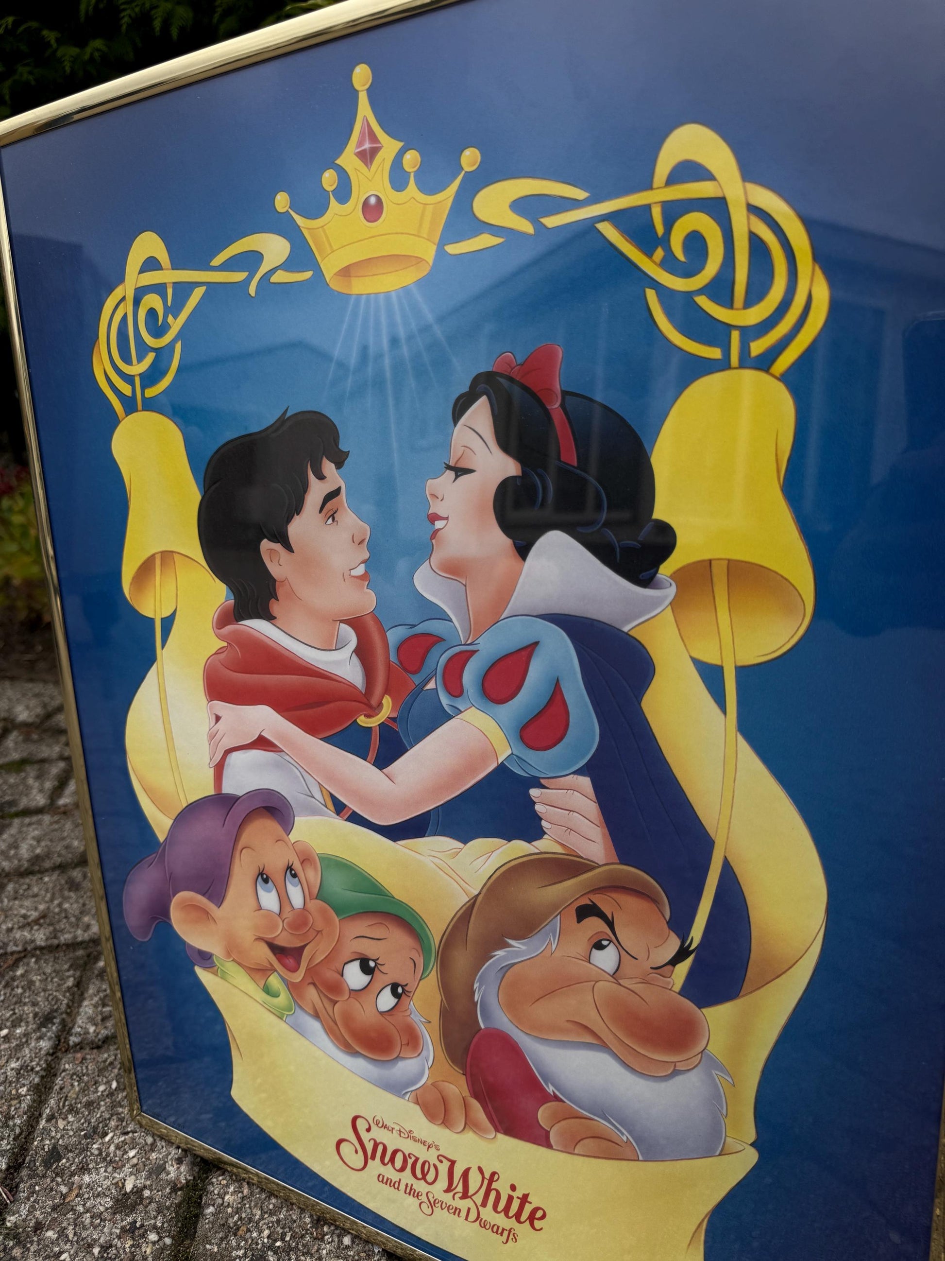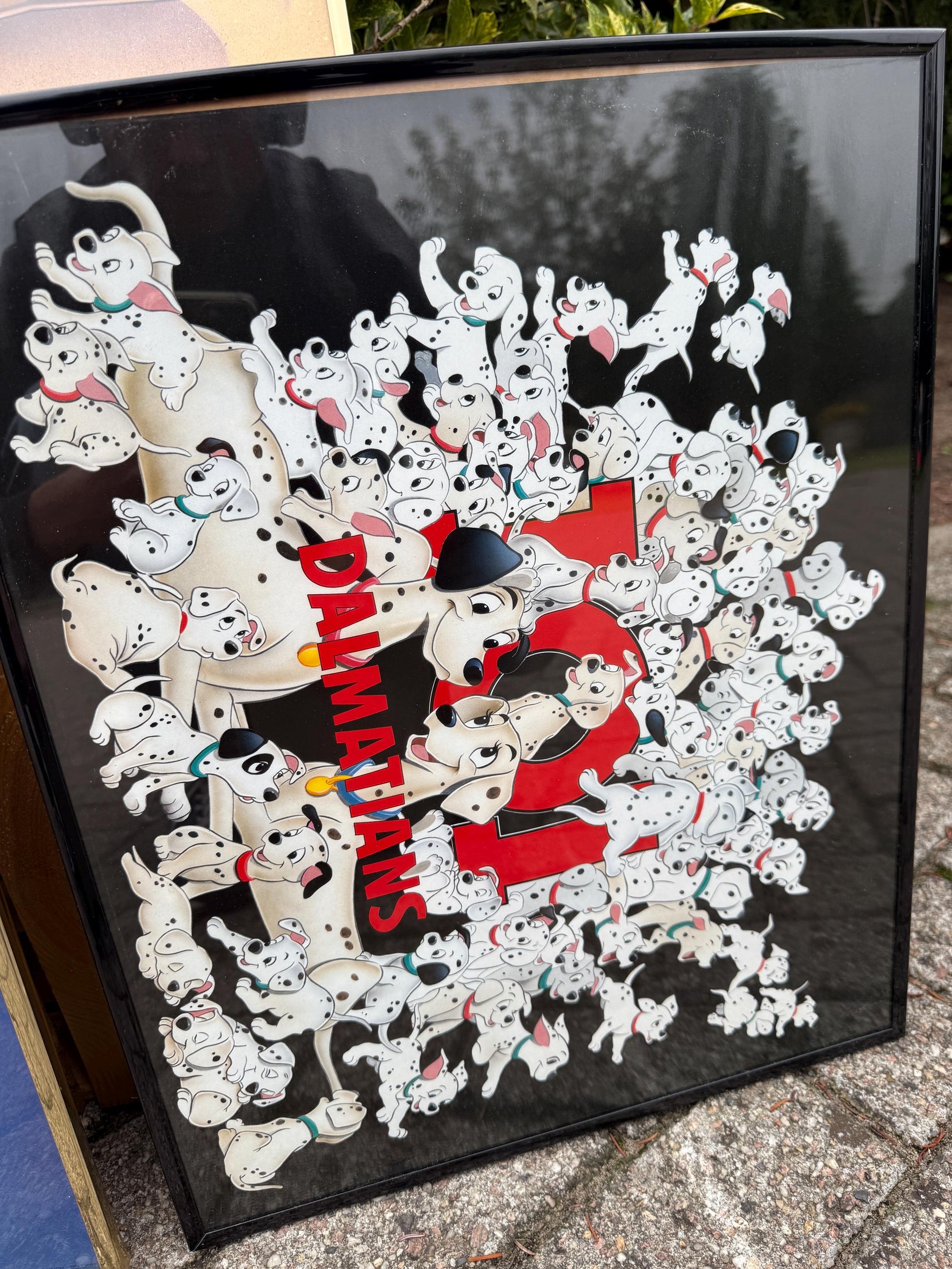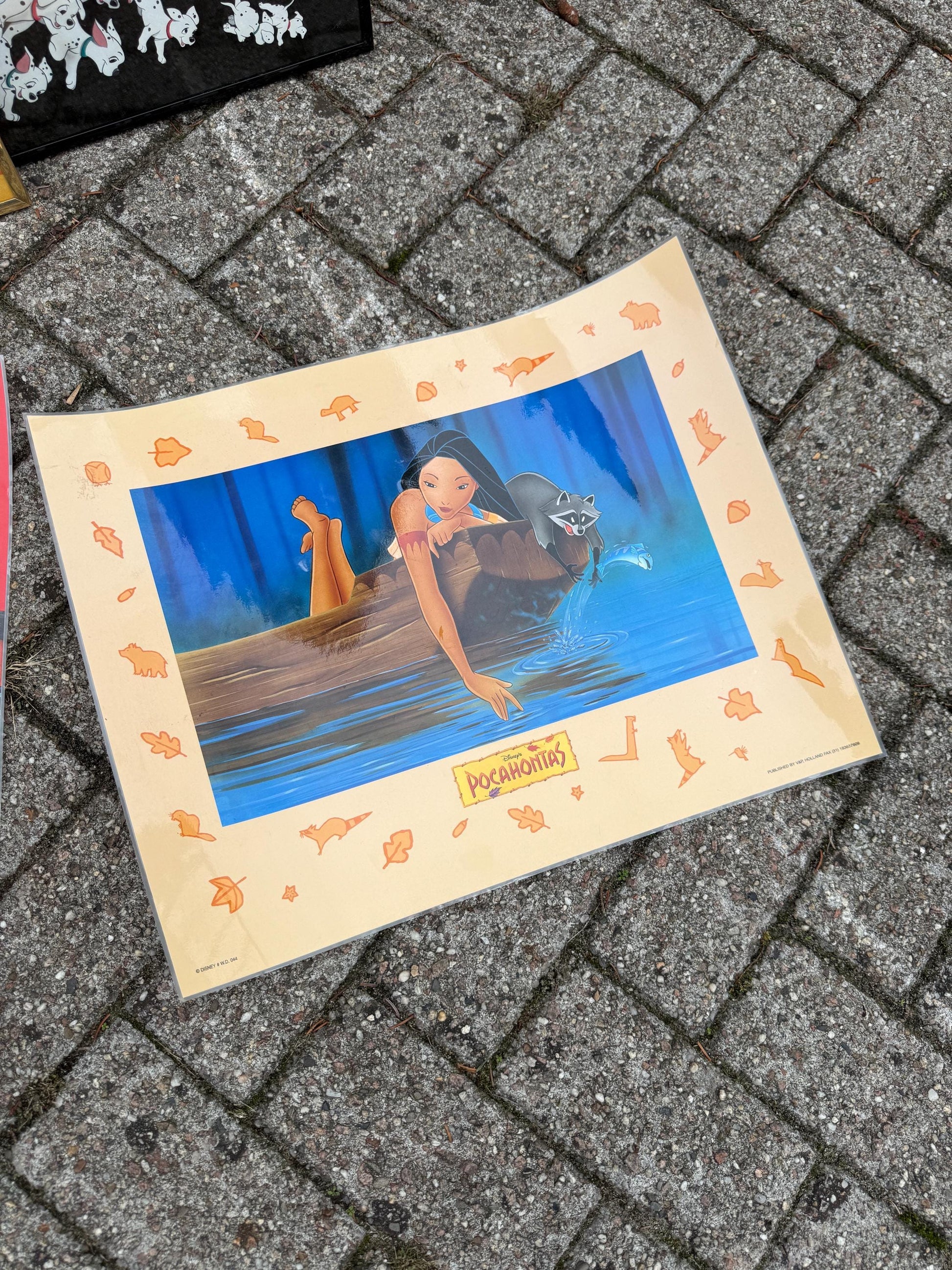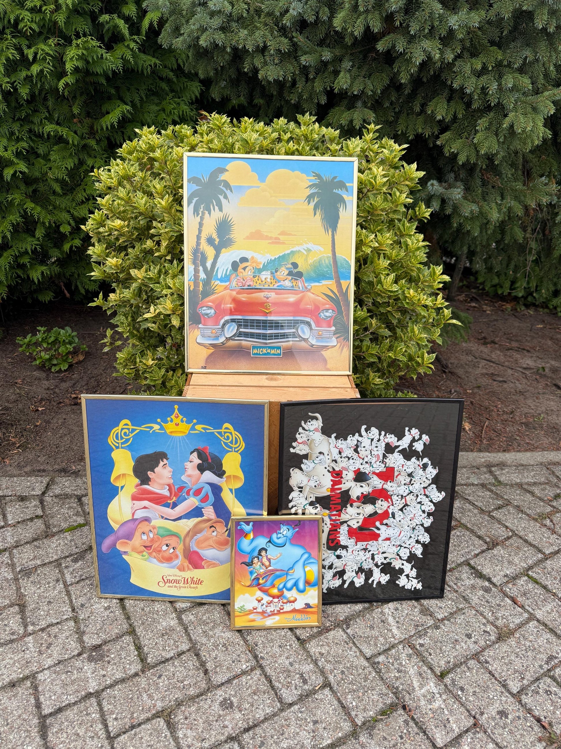 Original vintage Disney posters from the 1990s featuring classic films including The Lion King, Aladdin, Pocahontas, Snow White, A Goofy Movie, and 101 Dalmatians.