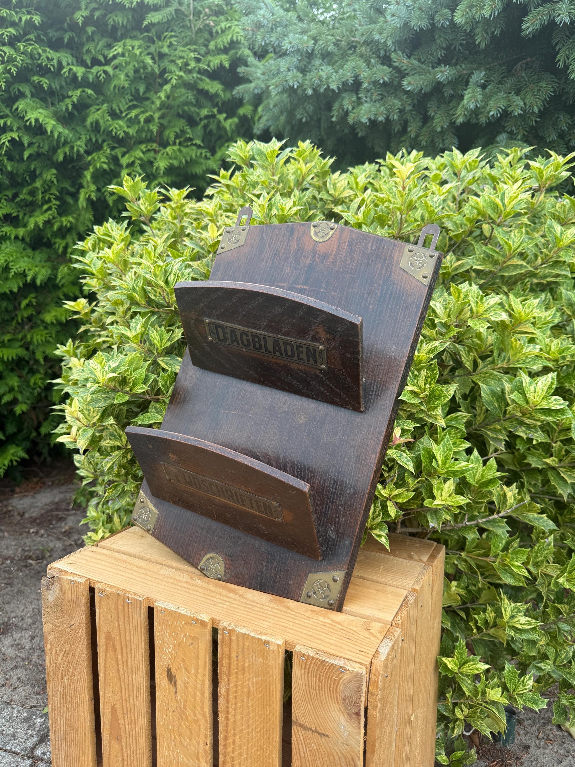 Vintage Dutch Wall-Mount Dagbladen & Tijdschriften Rack – Wood and Brass
