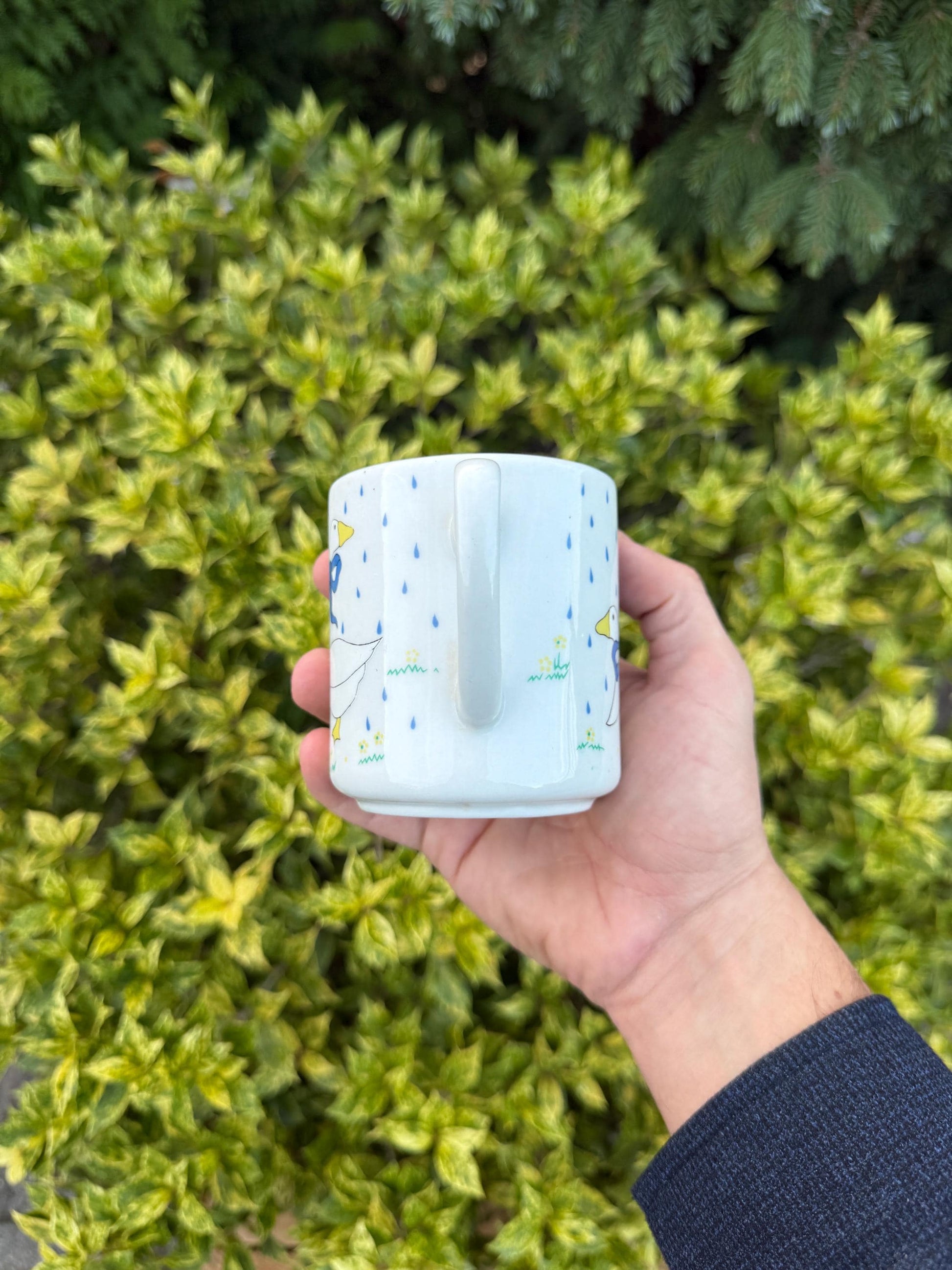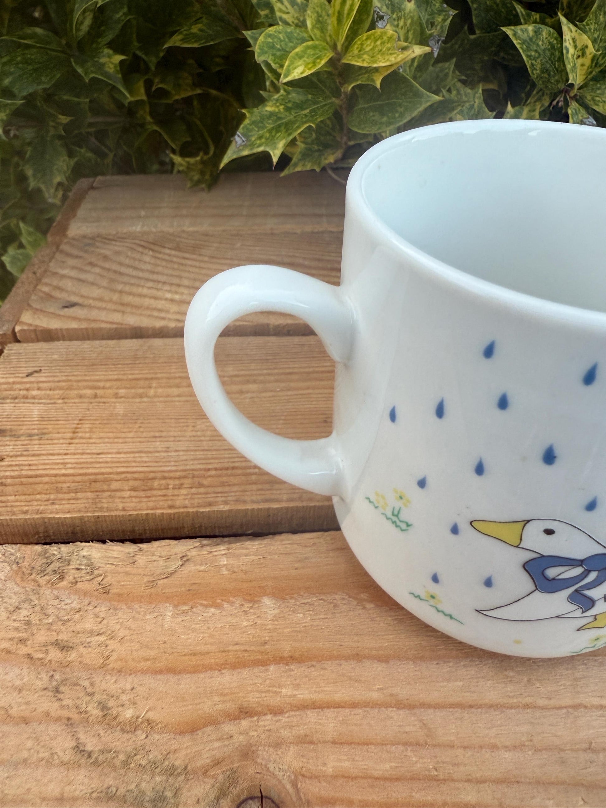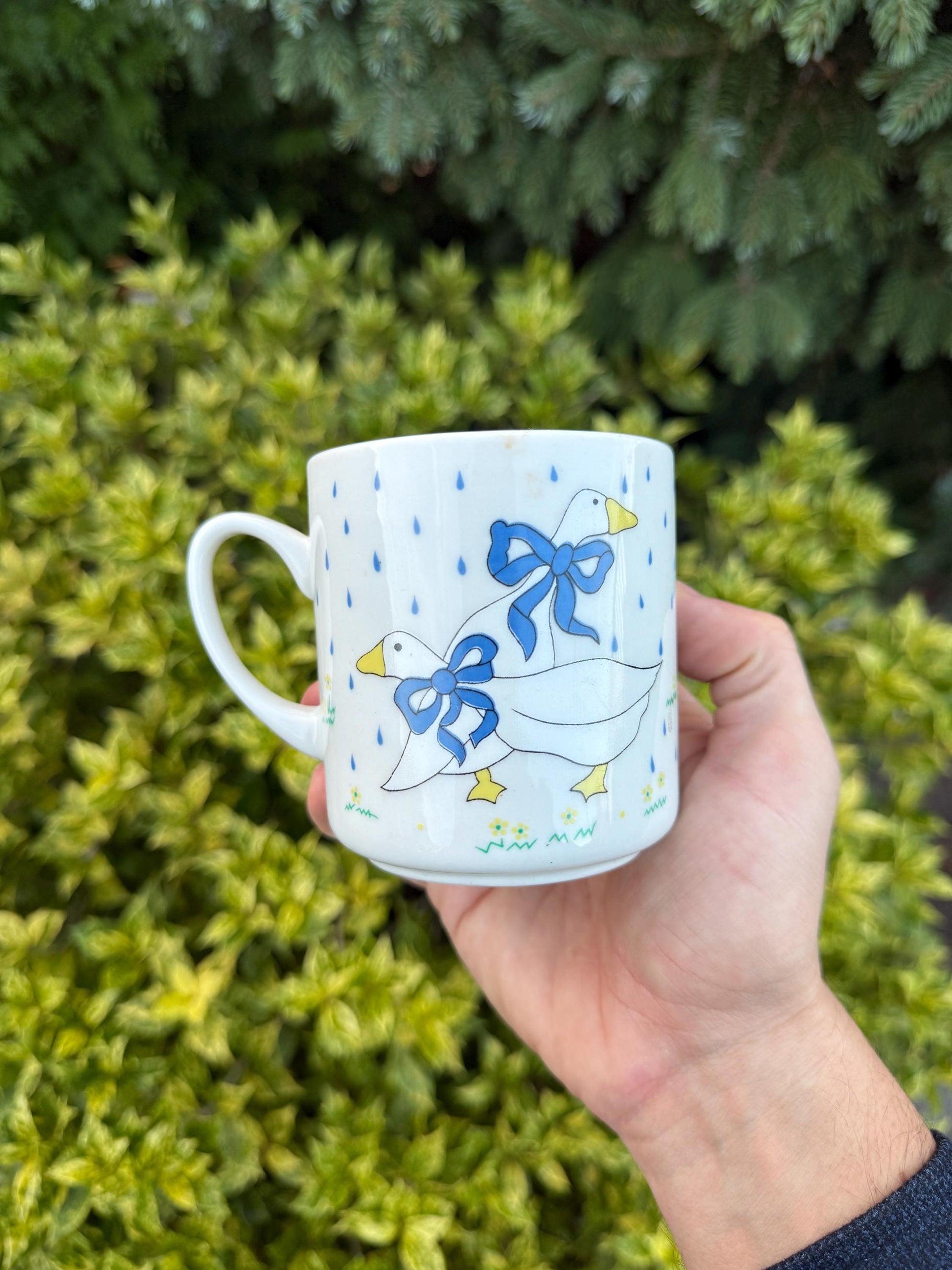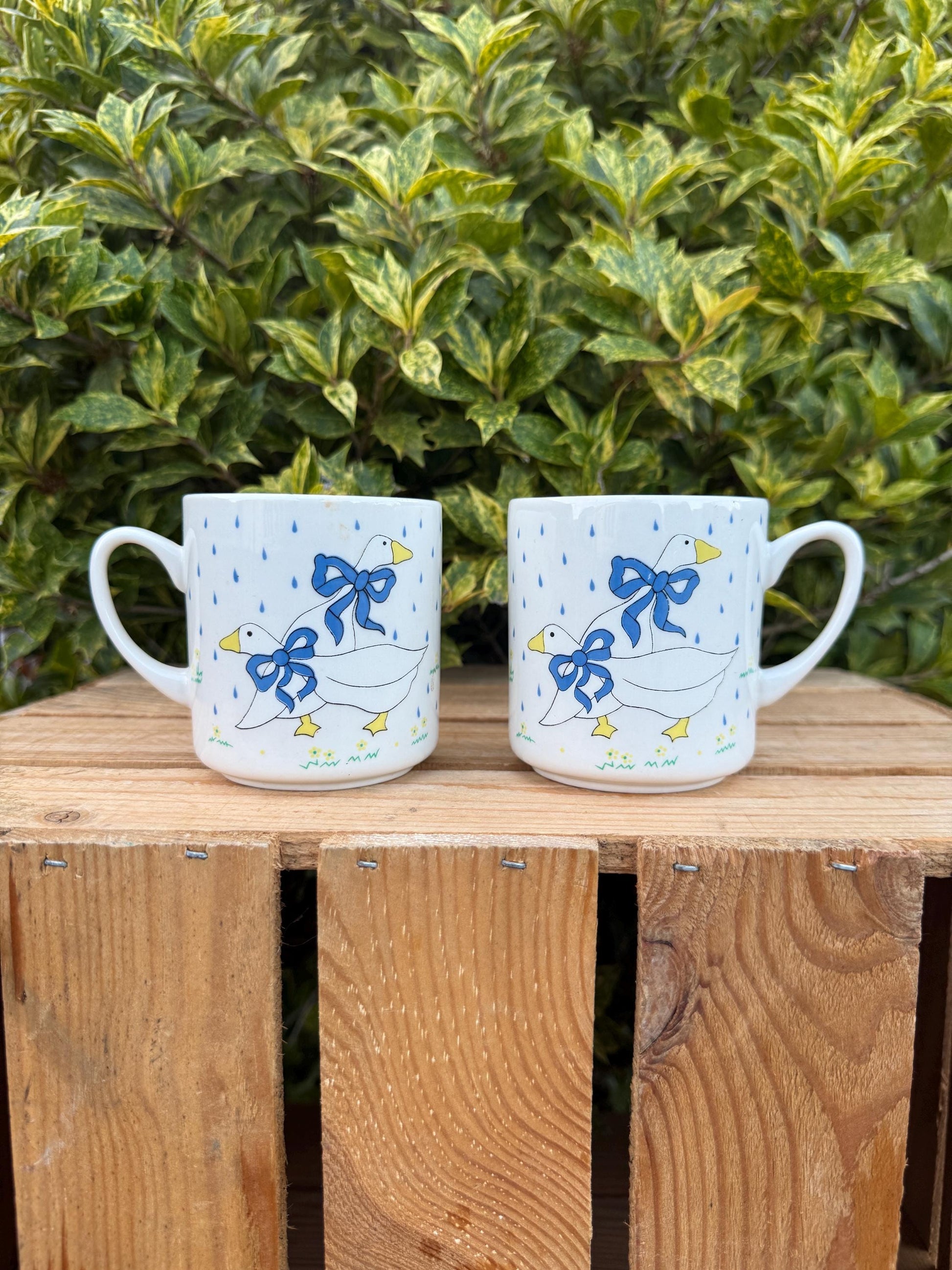 This vintage mug set features a playful goose design with blue ribbon details and light blue raindrop accents.