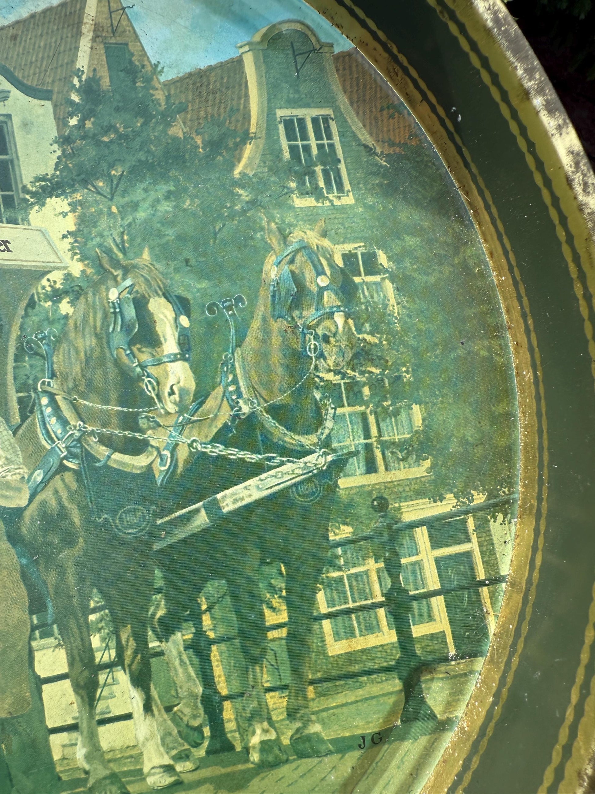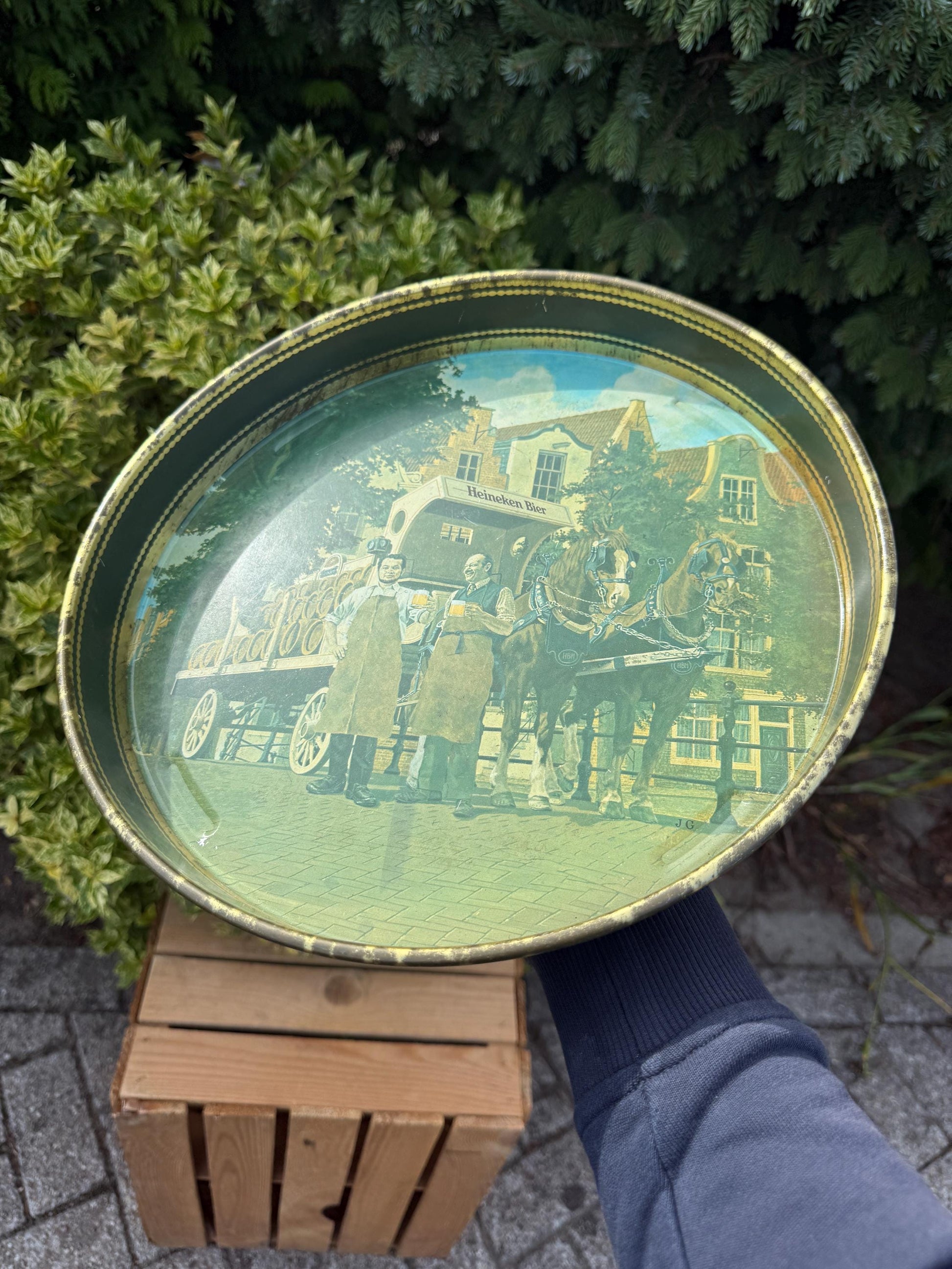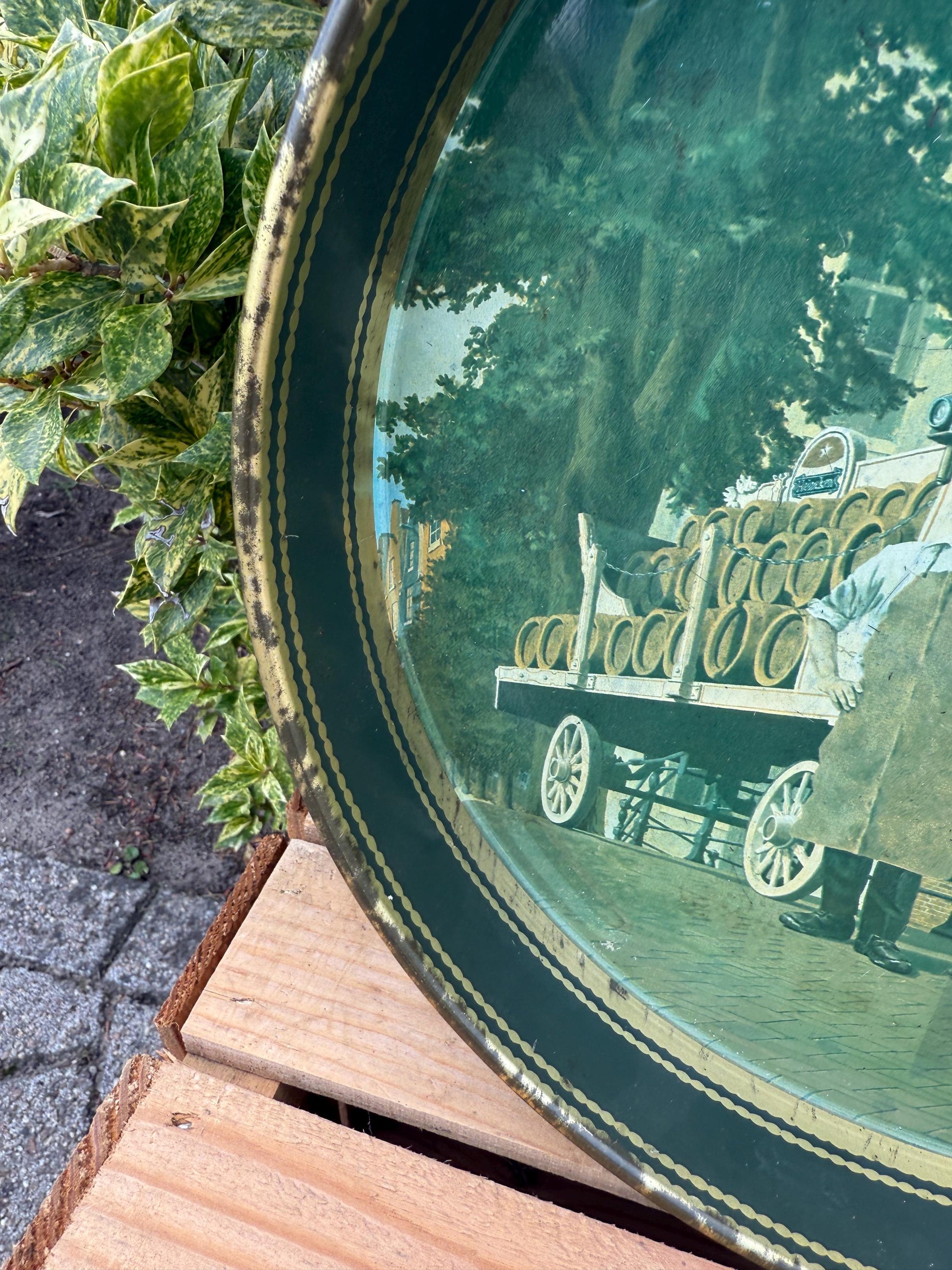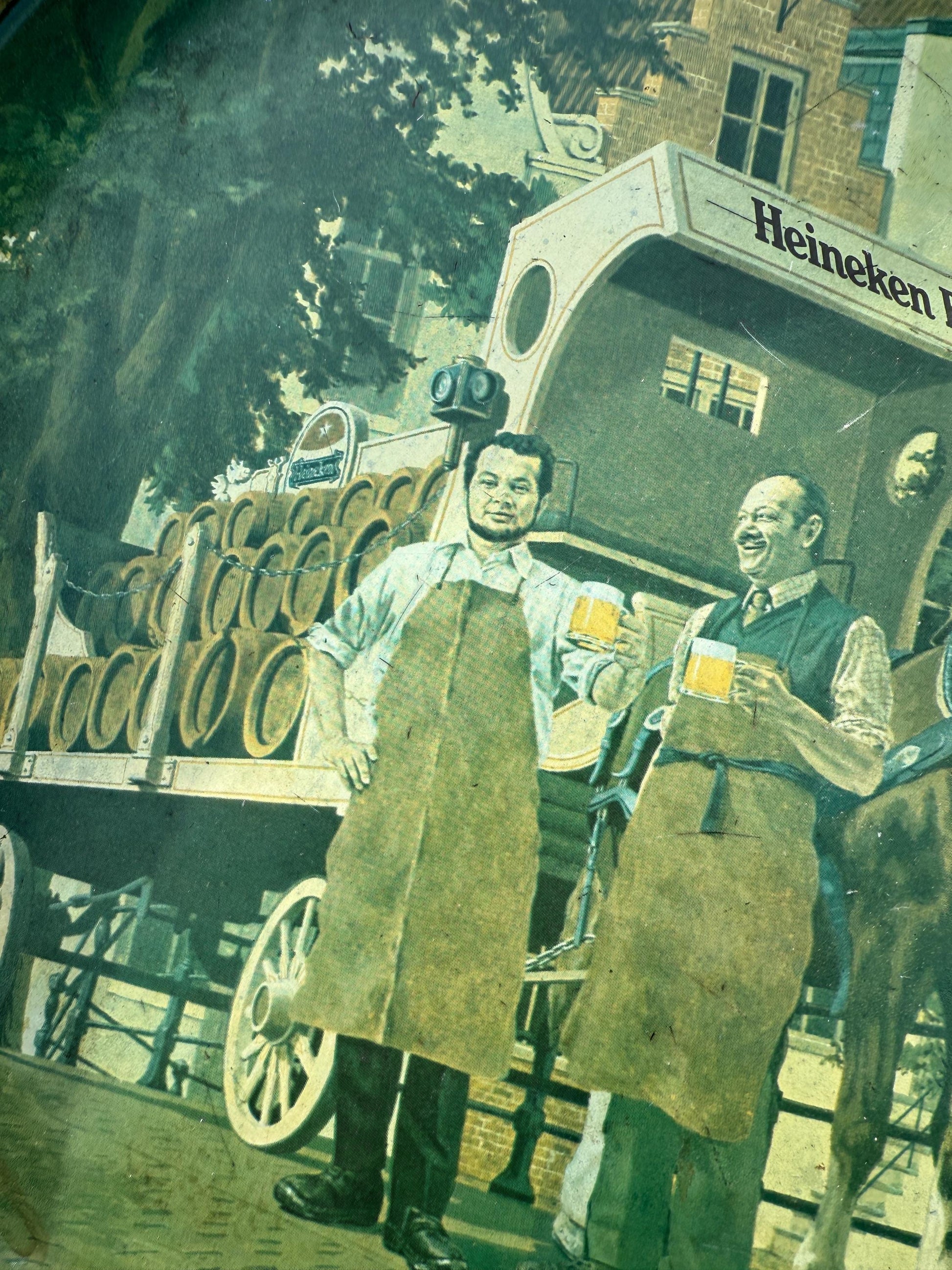 This vintage Heineken serving tray features a classic design with detailed artwork of horses pulling a Heineken barrel carriage, accompanied by two men in traditional attire.