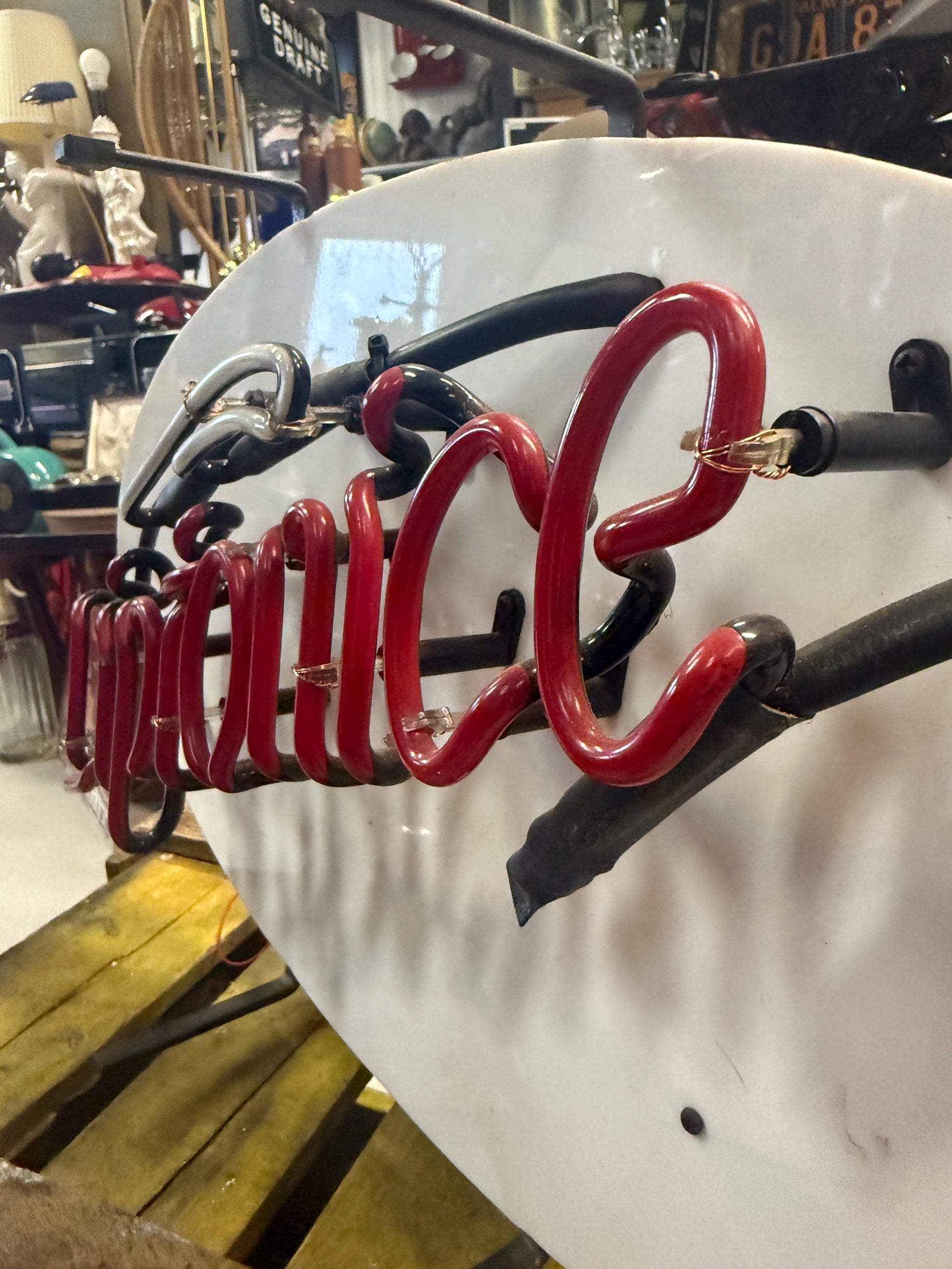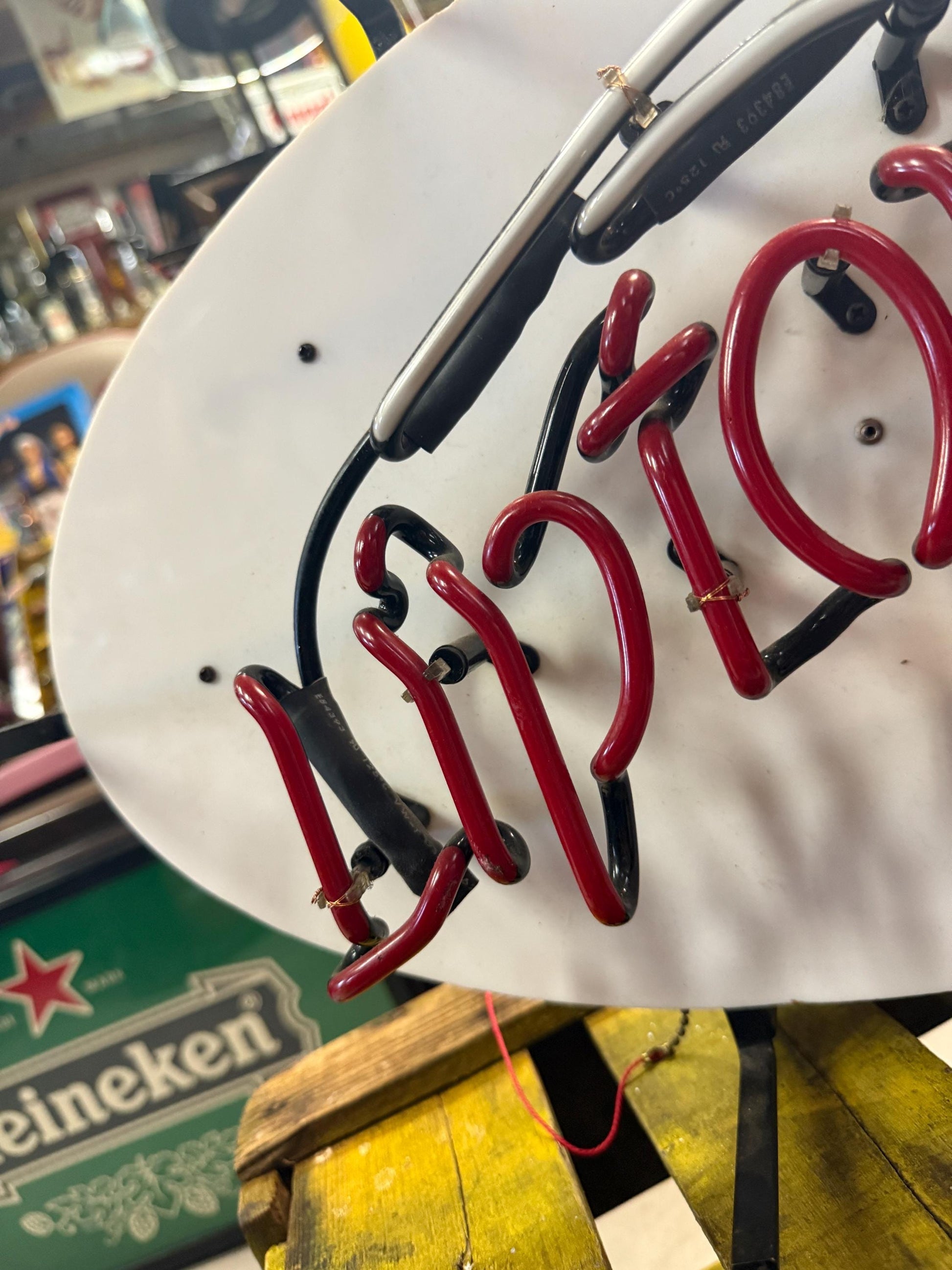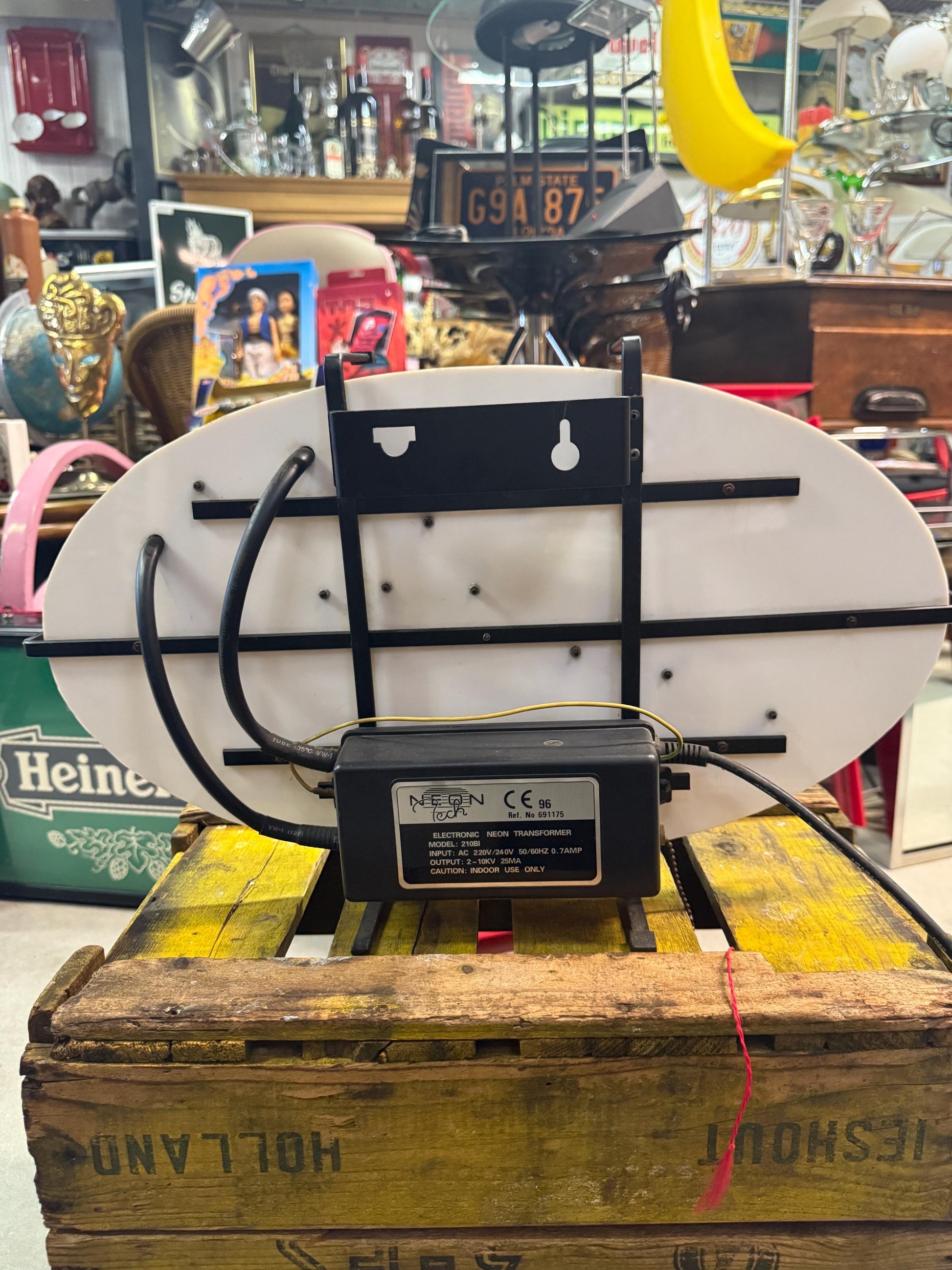 Original Liptonice neon sign from 1996 with red and green neon tubes mounted on a white oval plastic background.