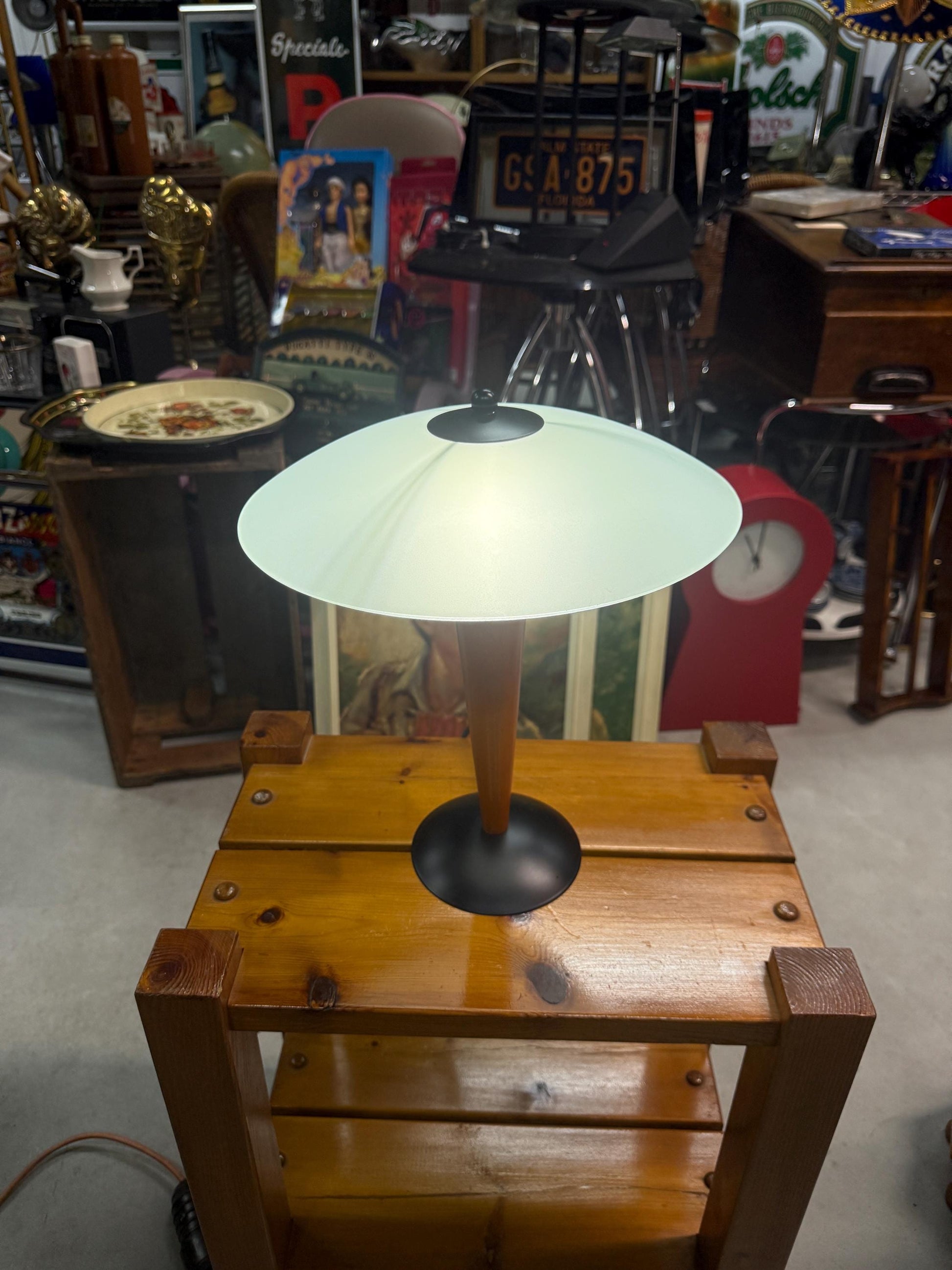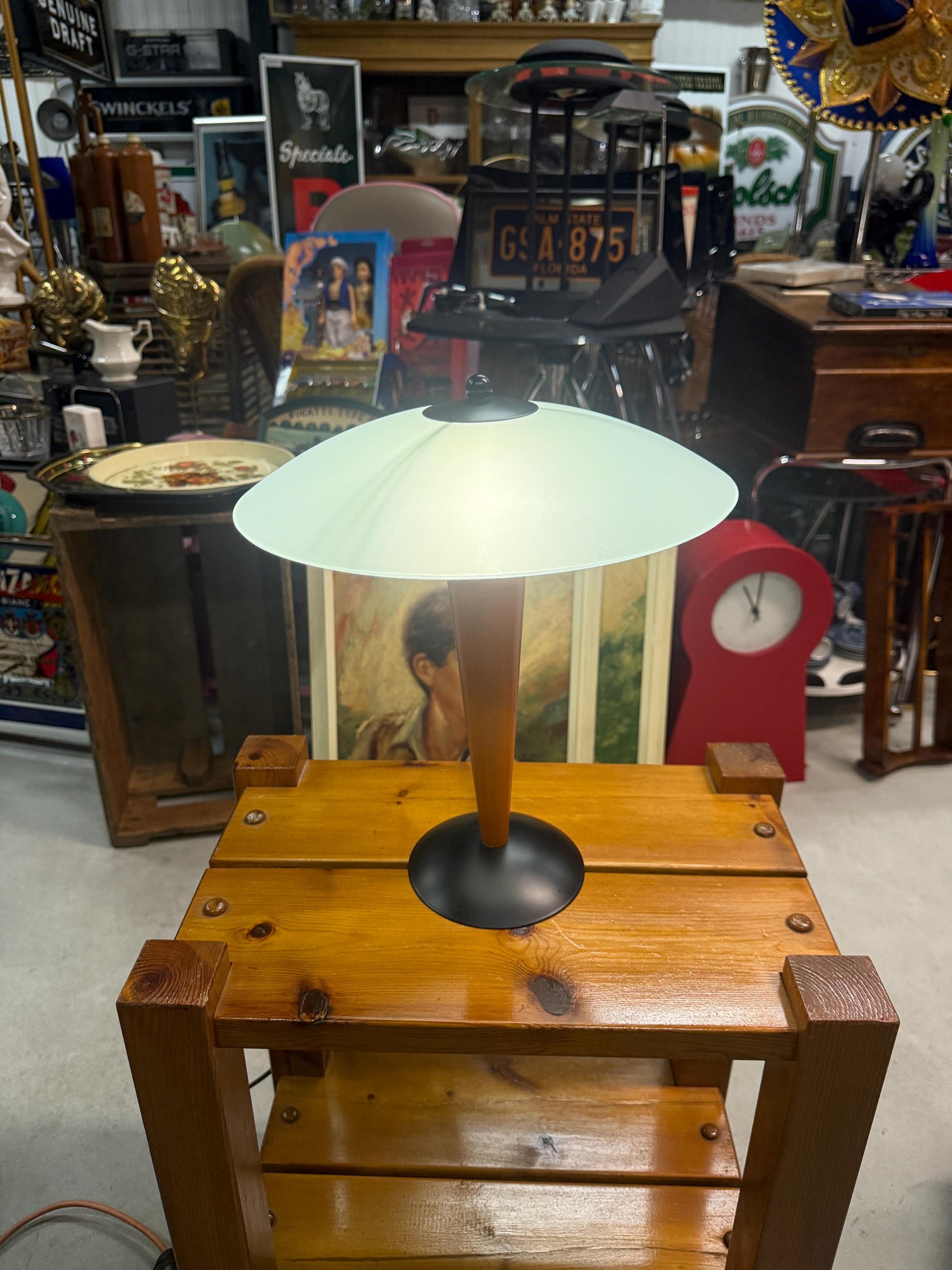 This vintage table lamp by Massive Belgium features a sculptural postmodern design with a teak wood base, black metal foot, and frosted glass shade.