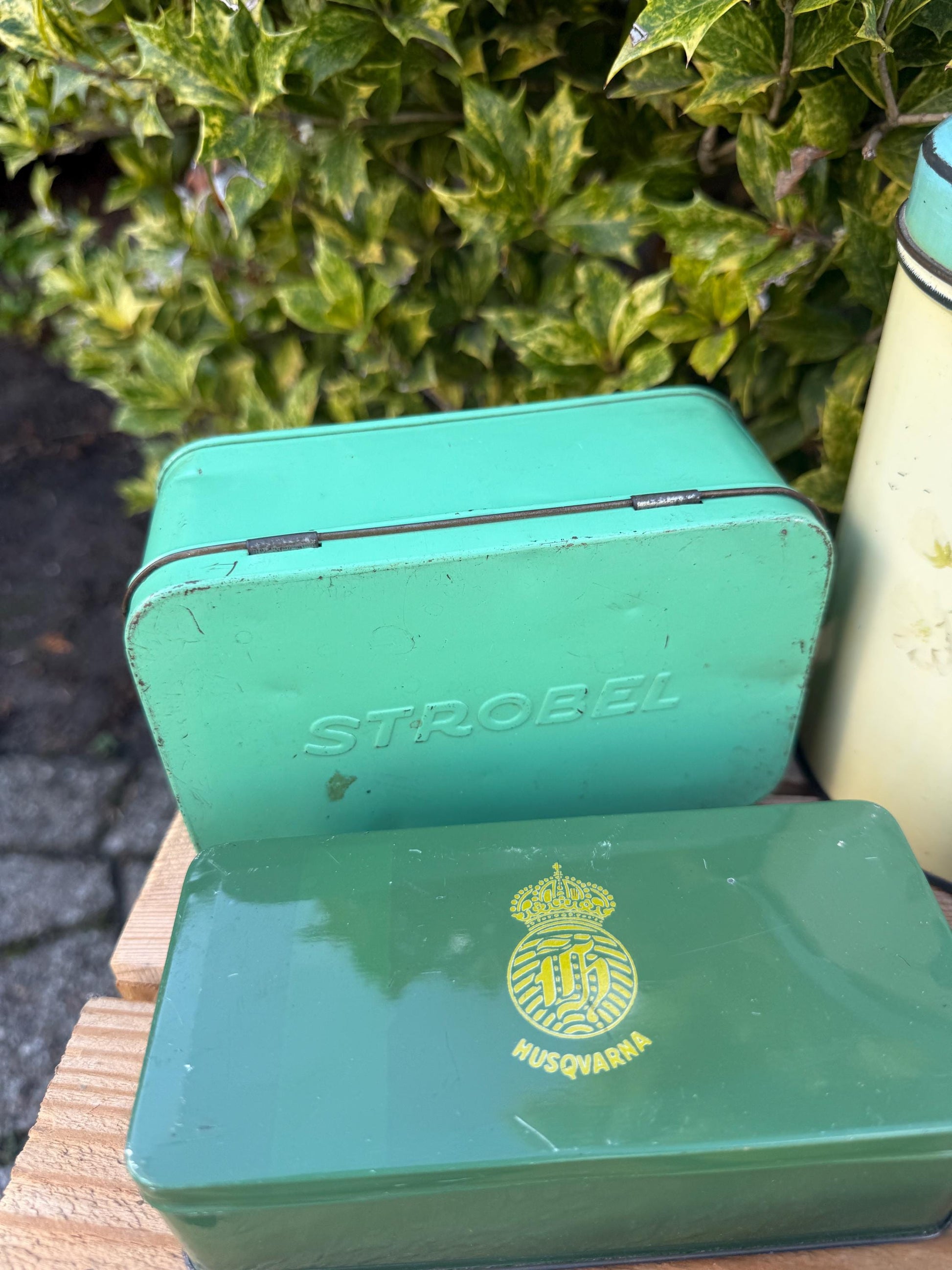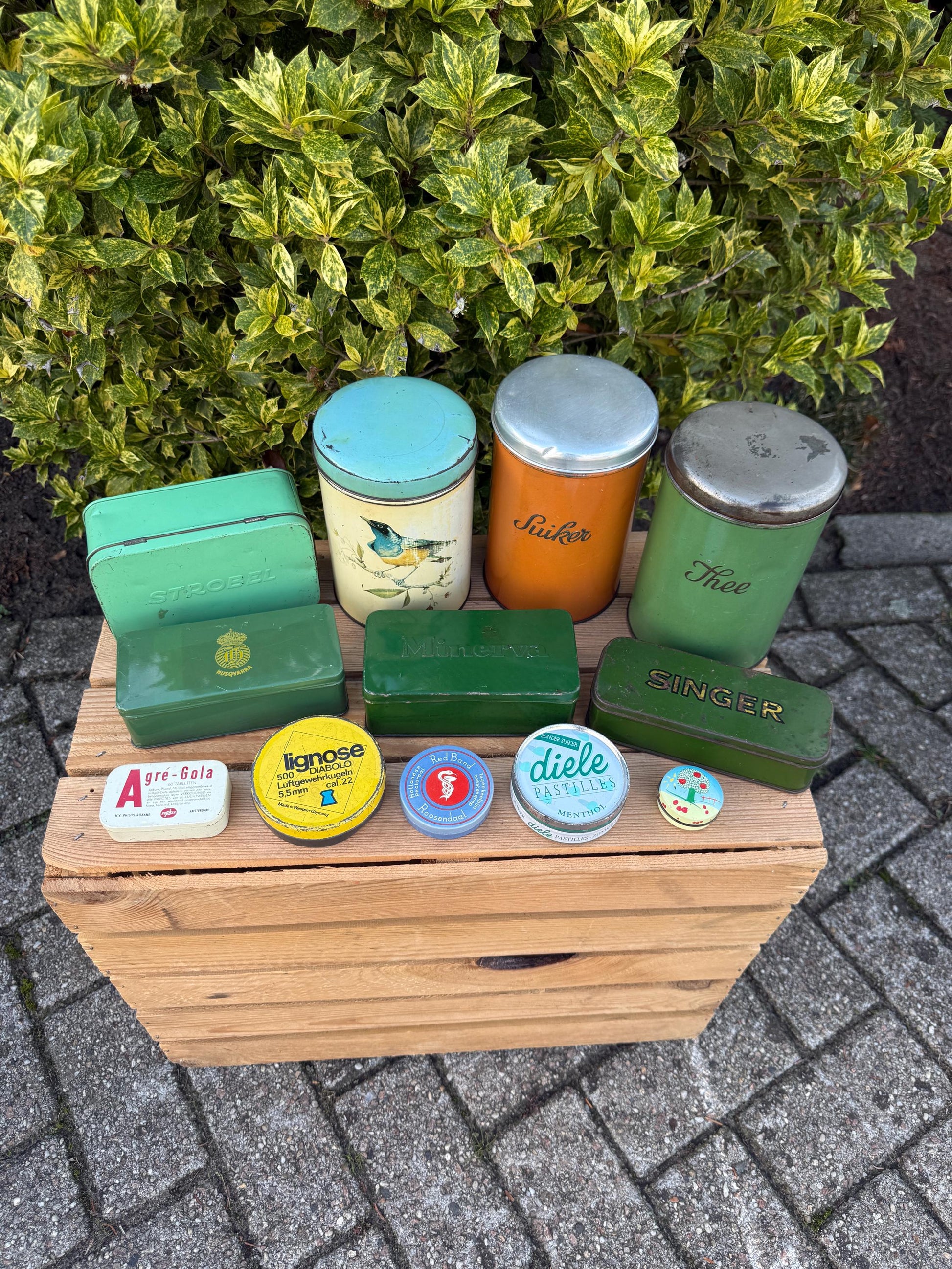 Vintage Metal Tins – Strobel, Minerva, Singer, Suiker, Thee, Agre-Gola, Lignose, Dielle Pastilles, Paul Bassett