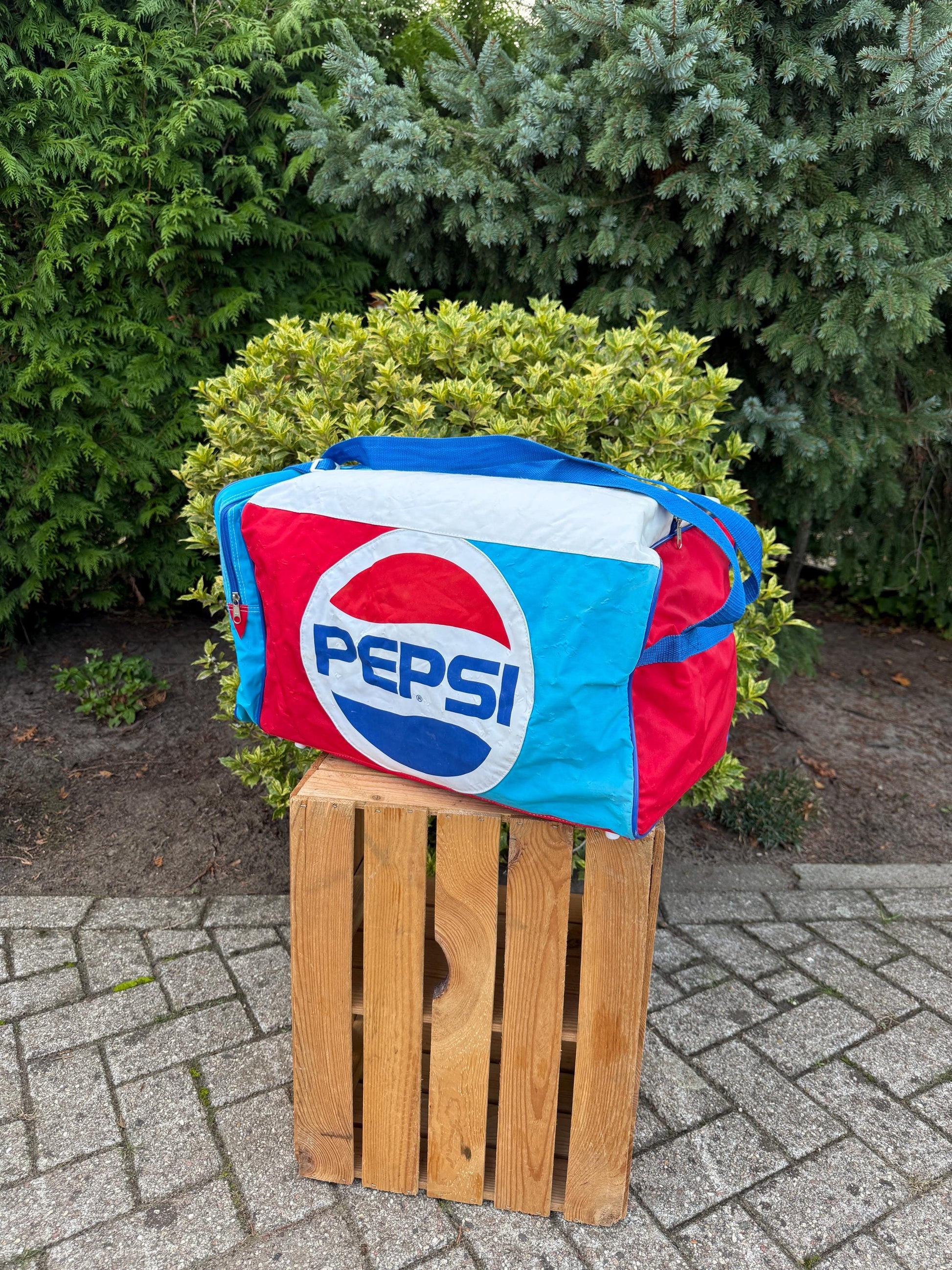 This vintage Pepsi duffel bag from the 1980s features the classic red, white, and blue Pepsi logo design.