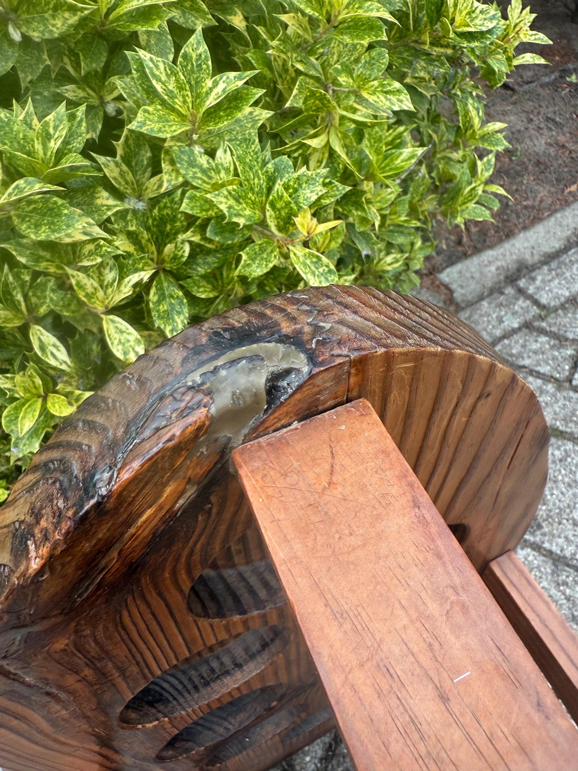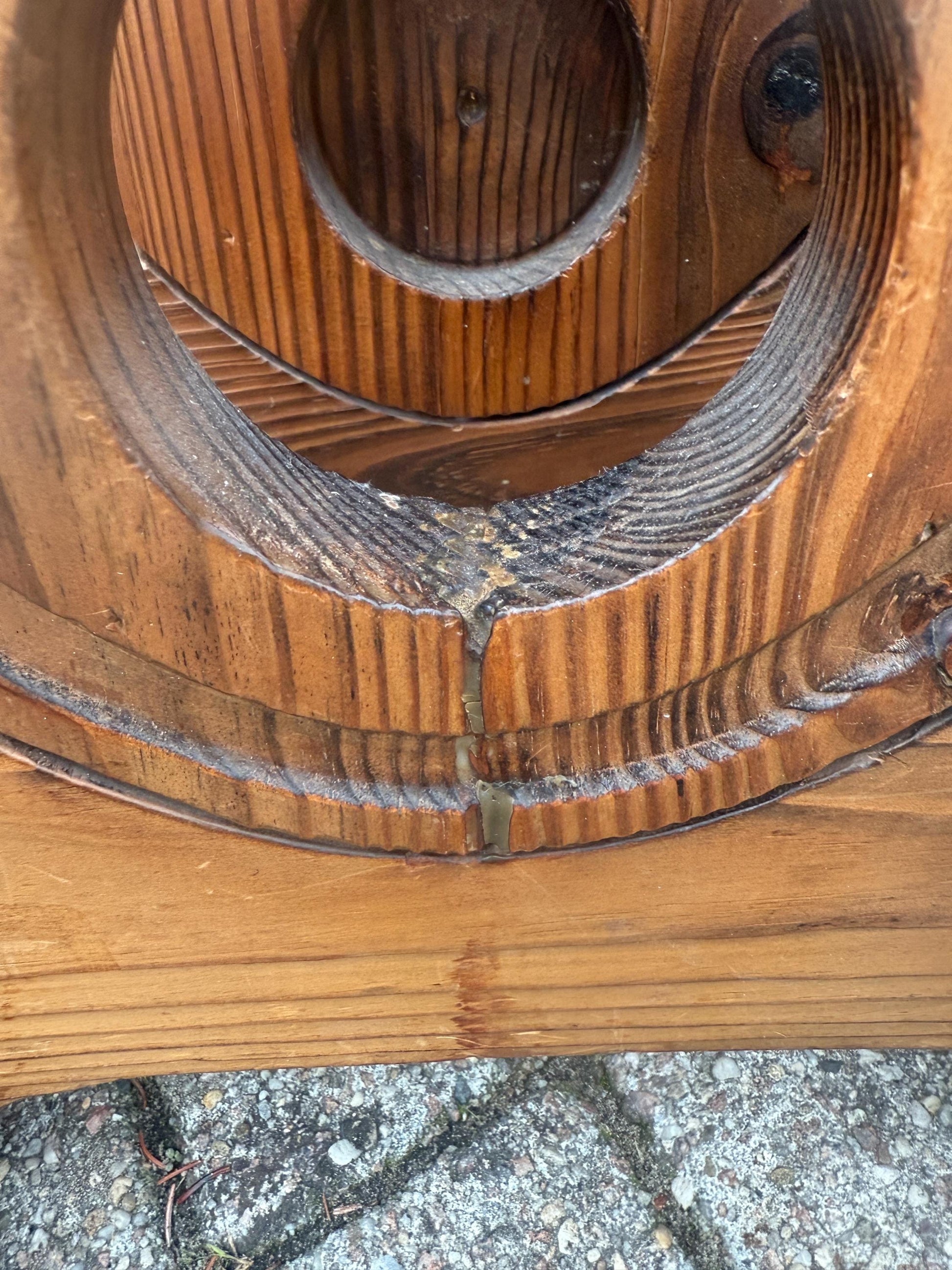 This vintage restored wine rack is crafted from solid wood and shaped like a wine barrel, featuring eight circular slots for bottles. It stands freely and serves as a decorative storage rack for a wine collection.