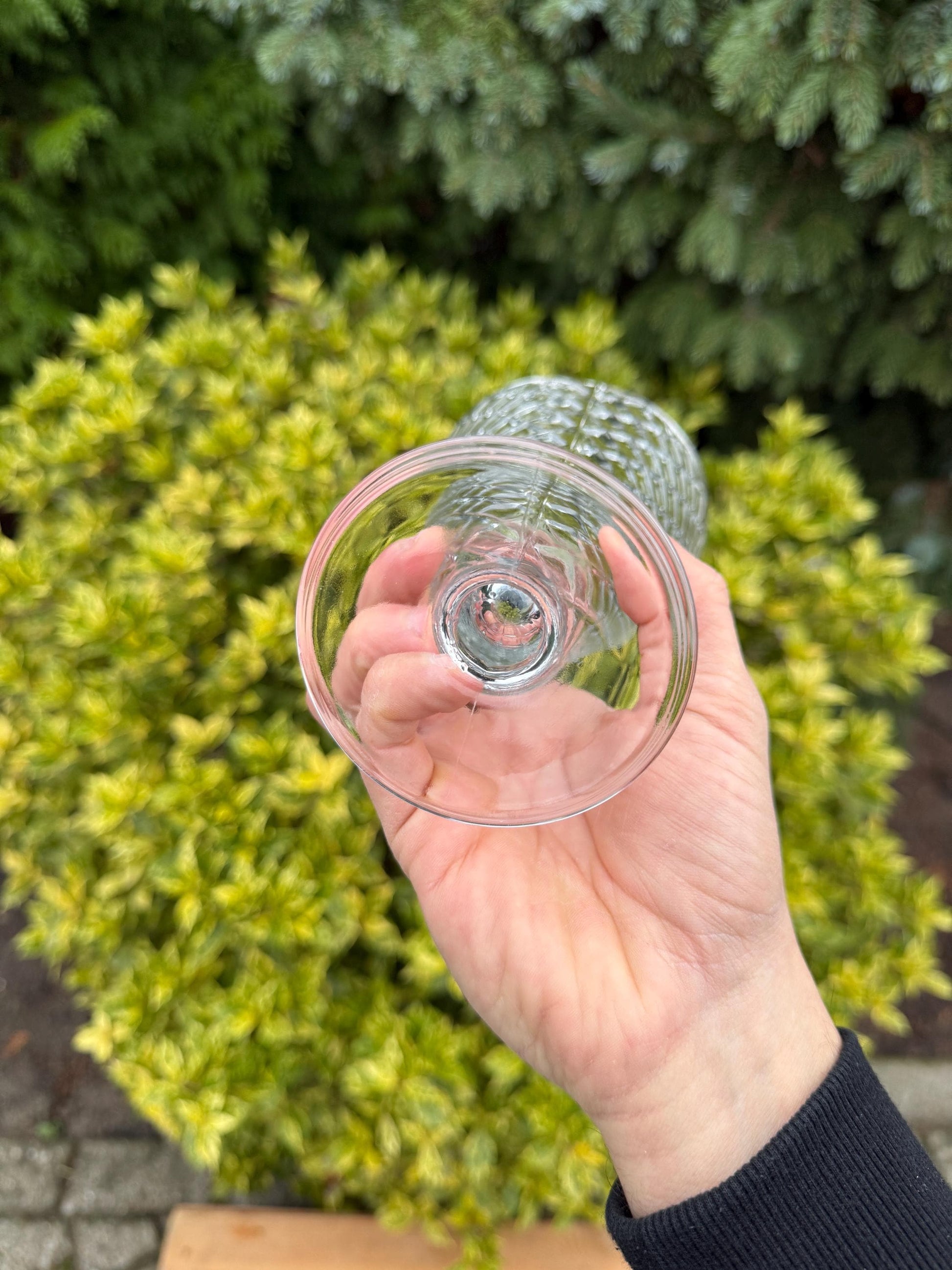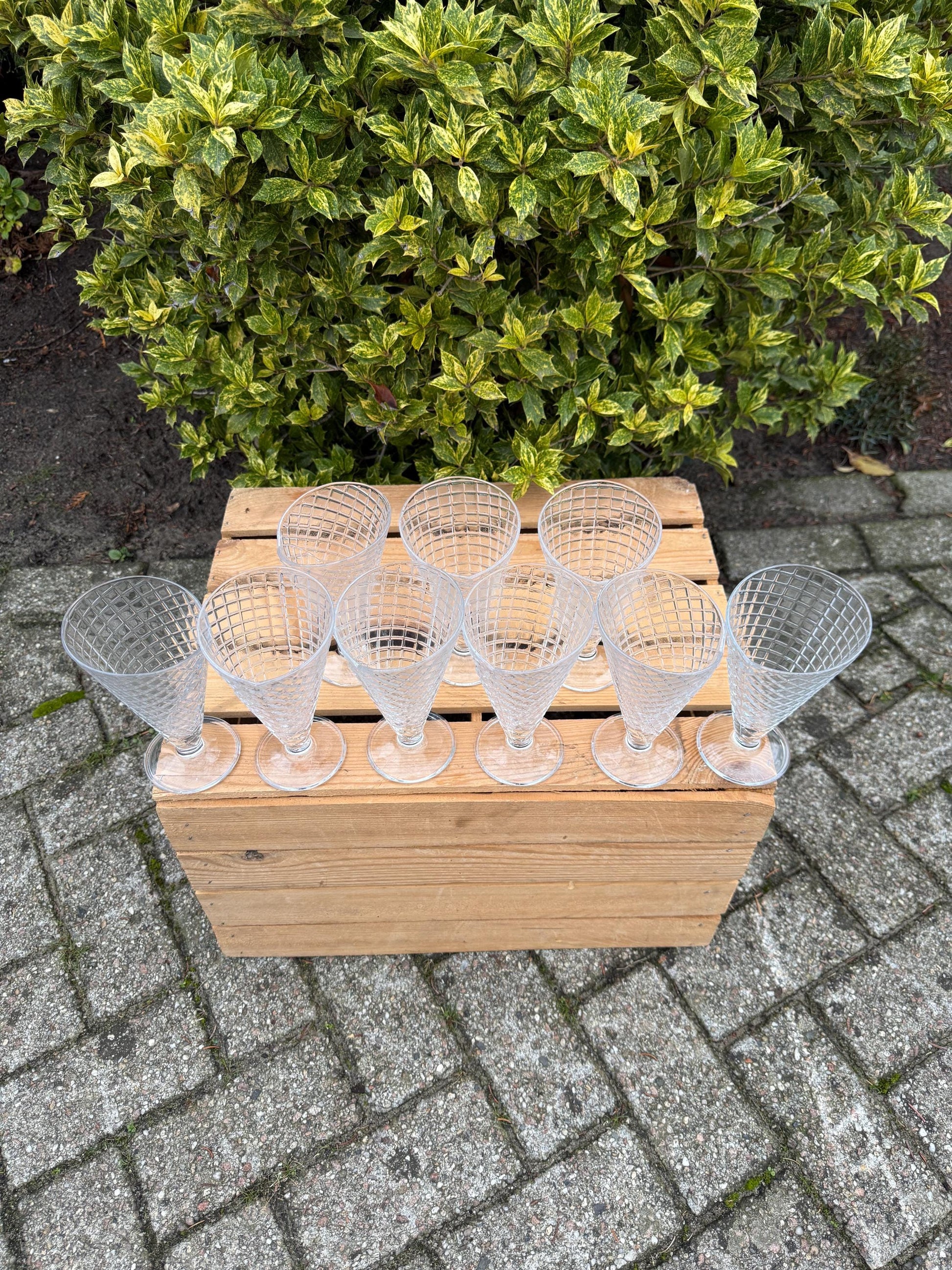 This vintage collection of waffle cone style ice cream glasses is made by Bormioli Rocco in Italy. The glasses feature a transparent waffle pattern with a clear top bowl. A frosted variant is also available. Suitable for desserts, ice cream or milkshakes.