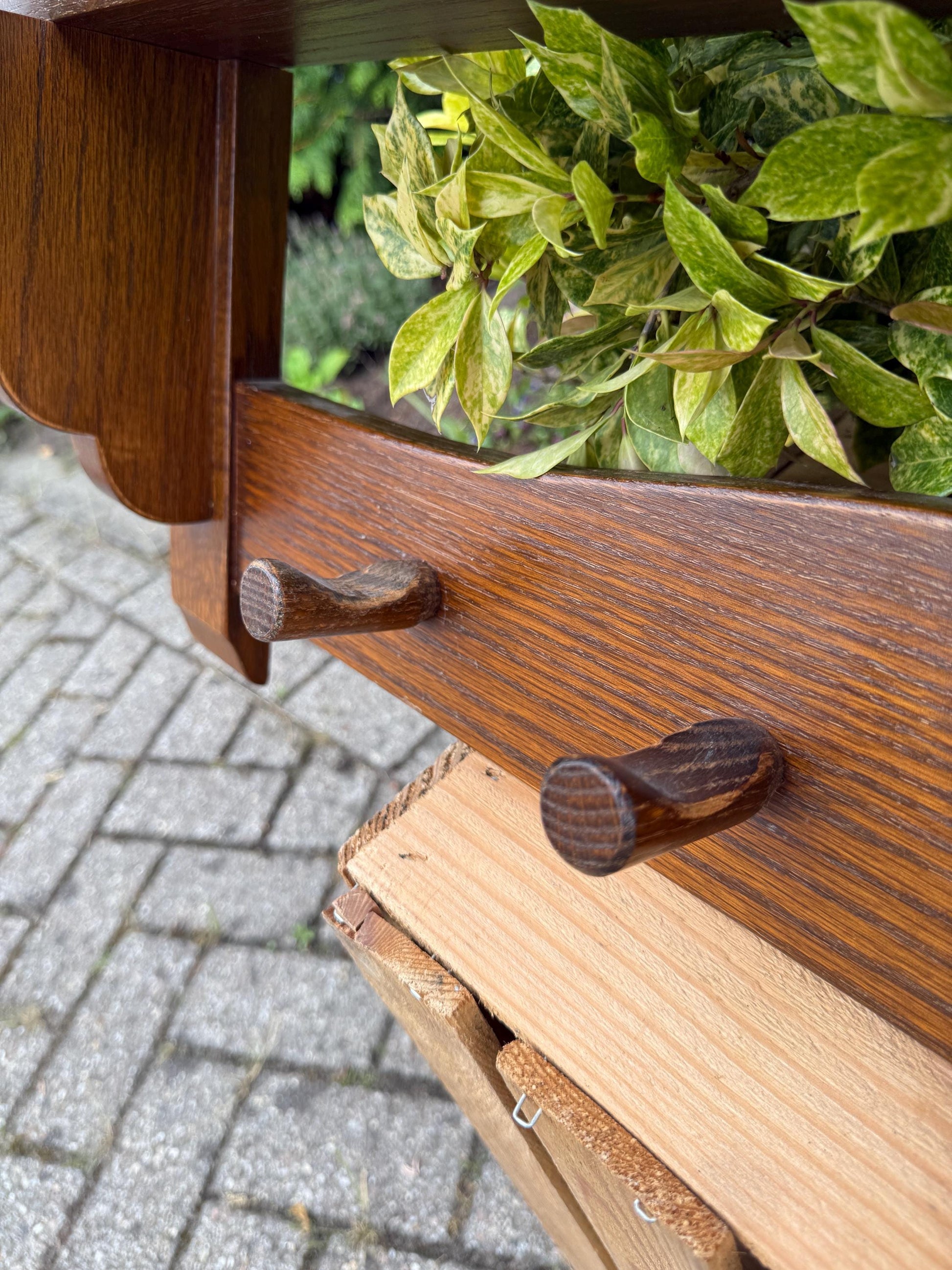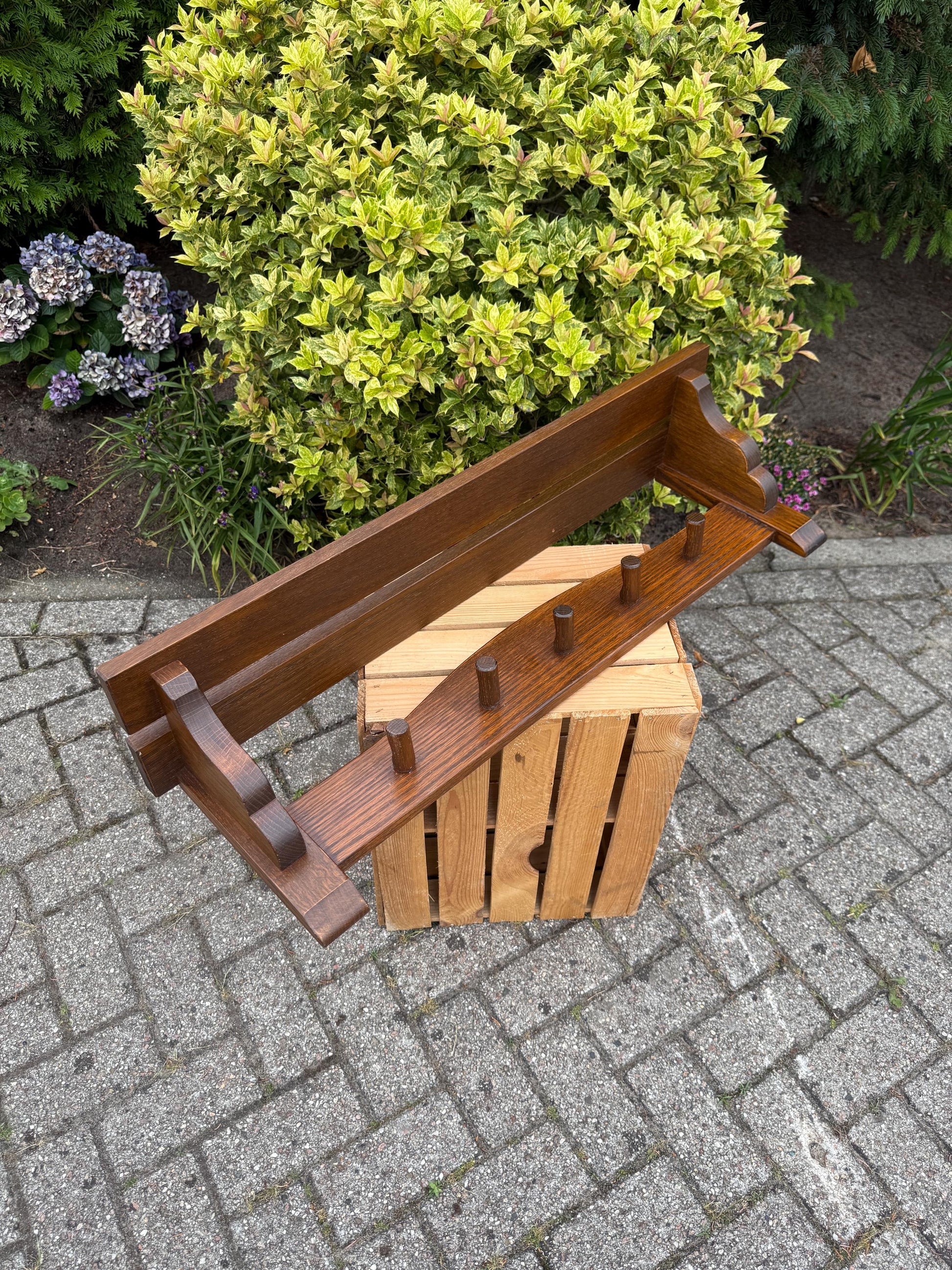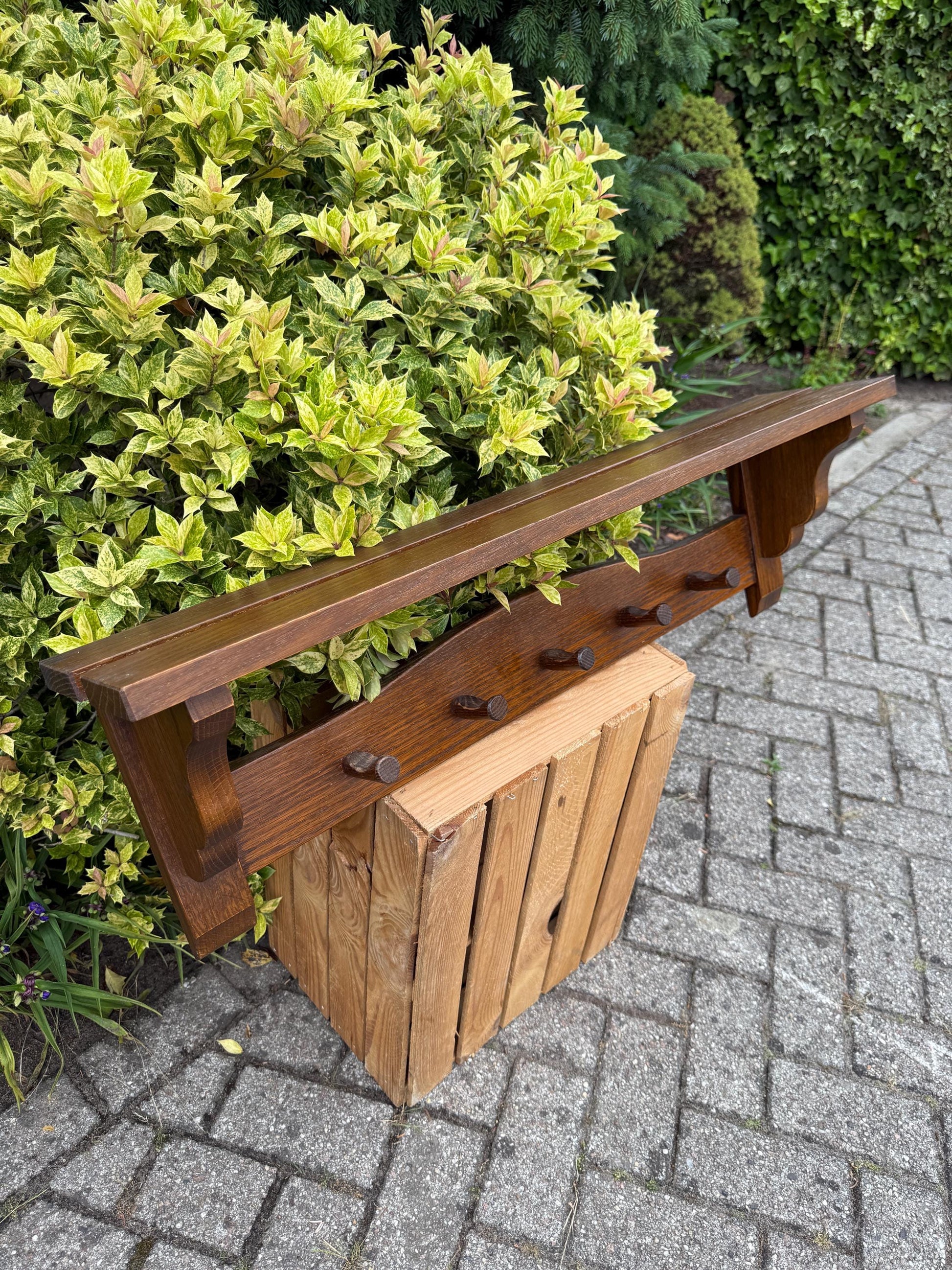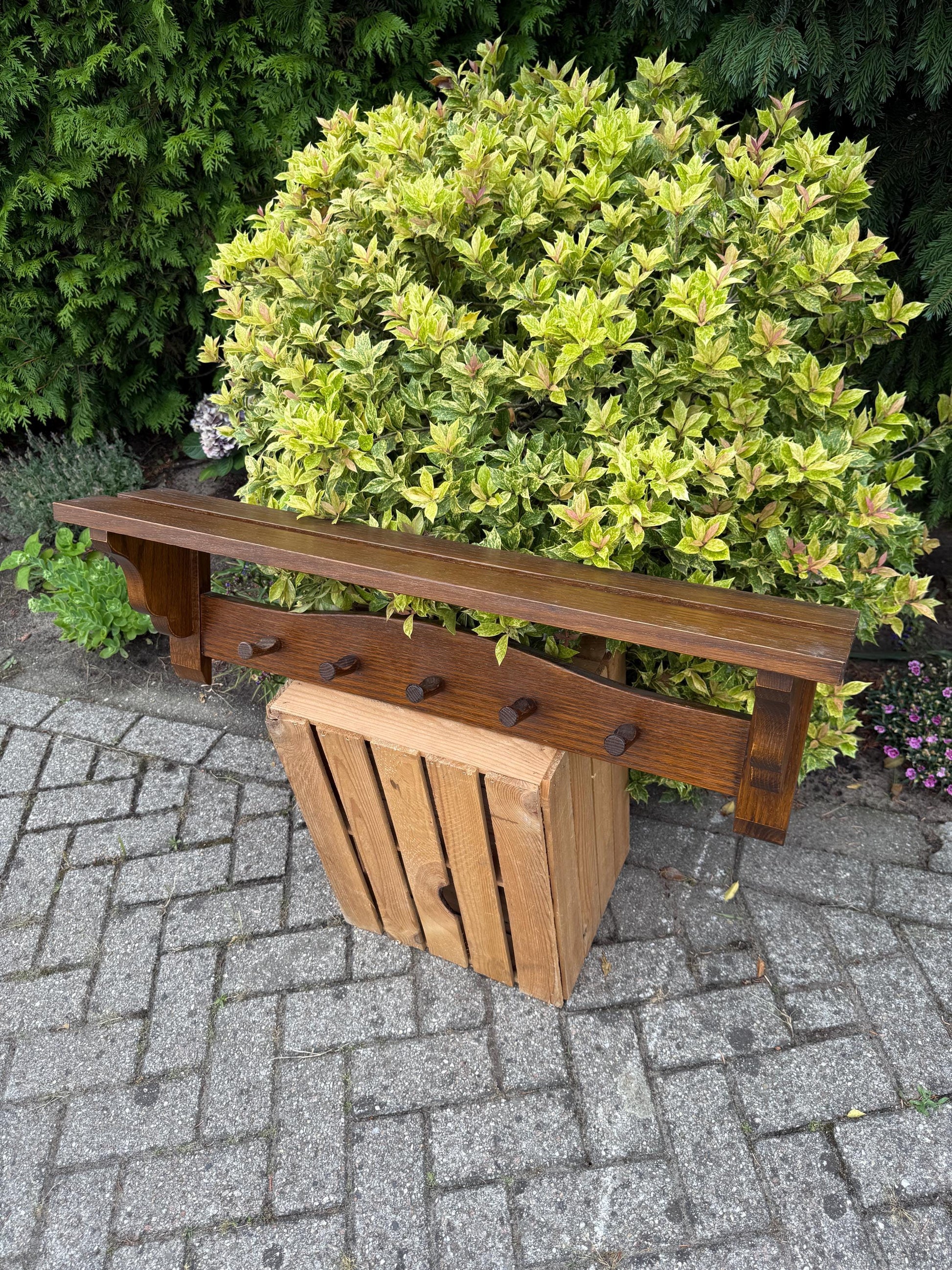 This vintage wooden coat rack features a robust farmhouse design with five sturdy wooden pegs and a solid top shelf for hats or accessories.