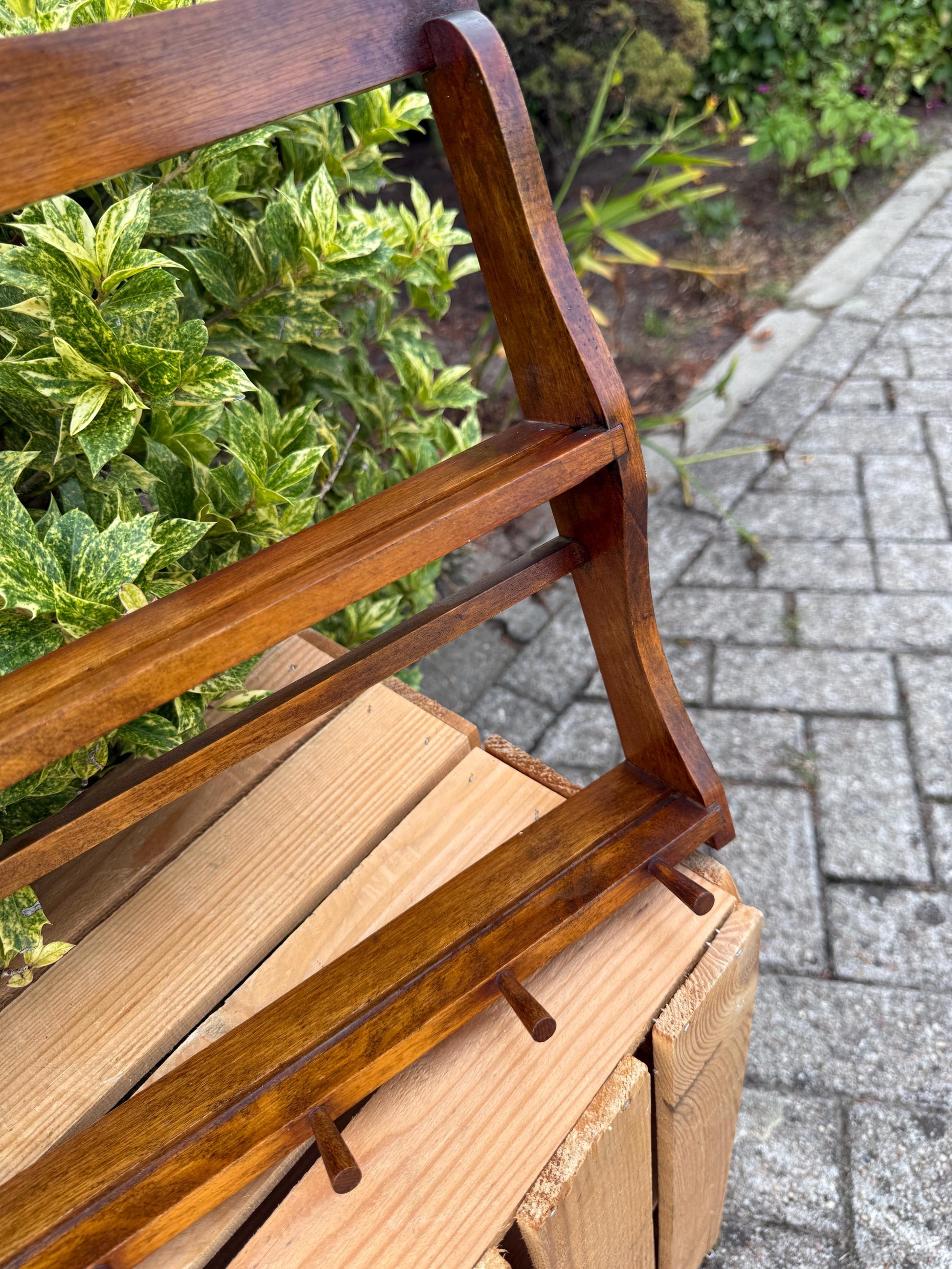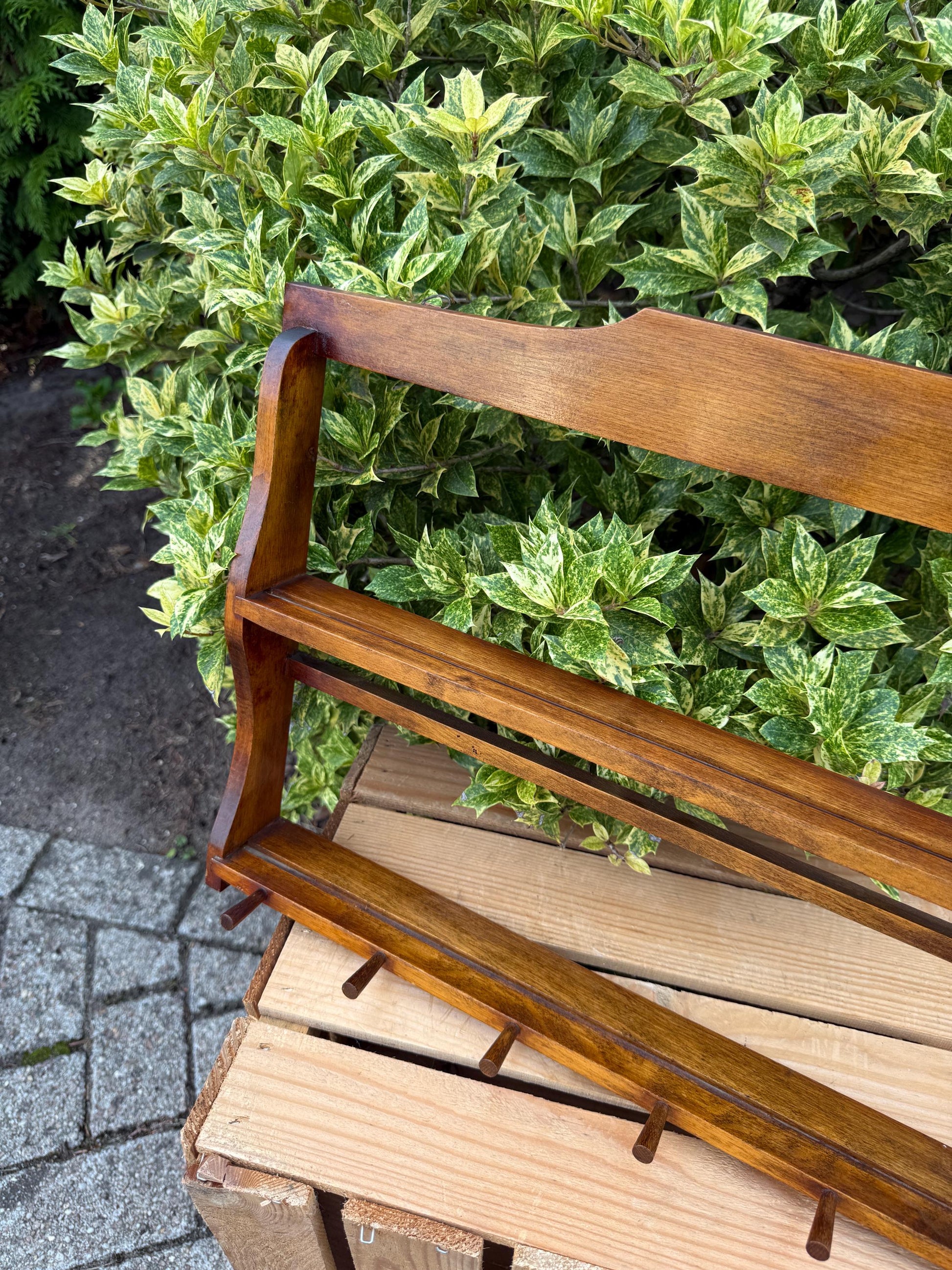 This vintage wooden wall rack offers multifunctional storage with six pegs for hanging mugs or utensils, plus a narrow shelf ideal for small spice jars or decorative plates.